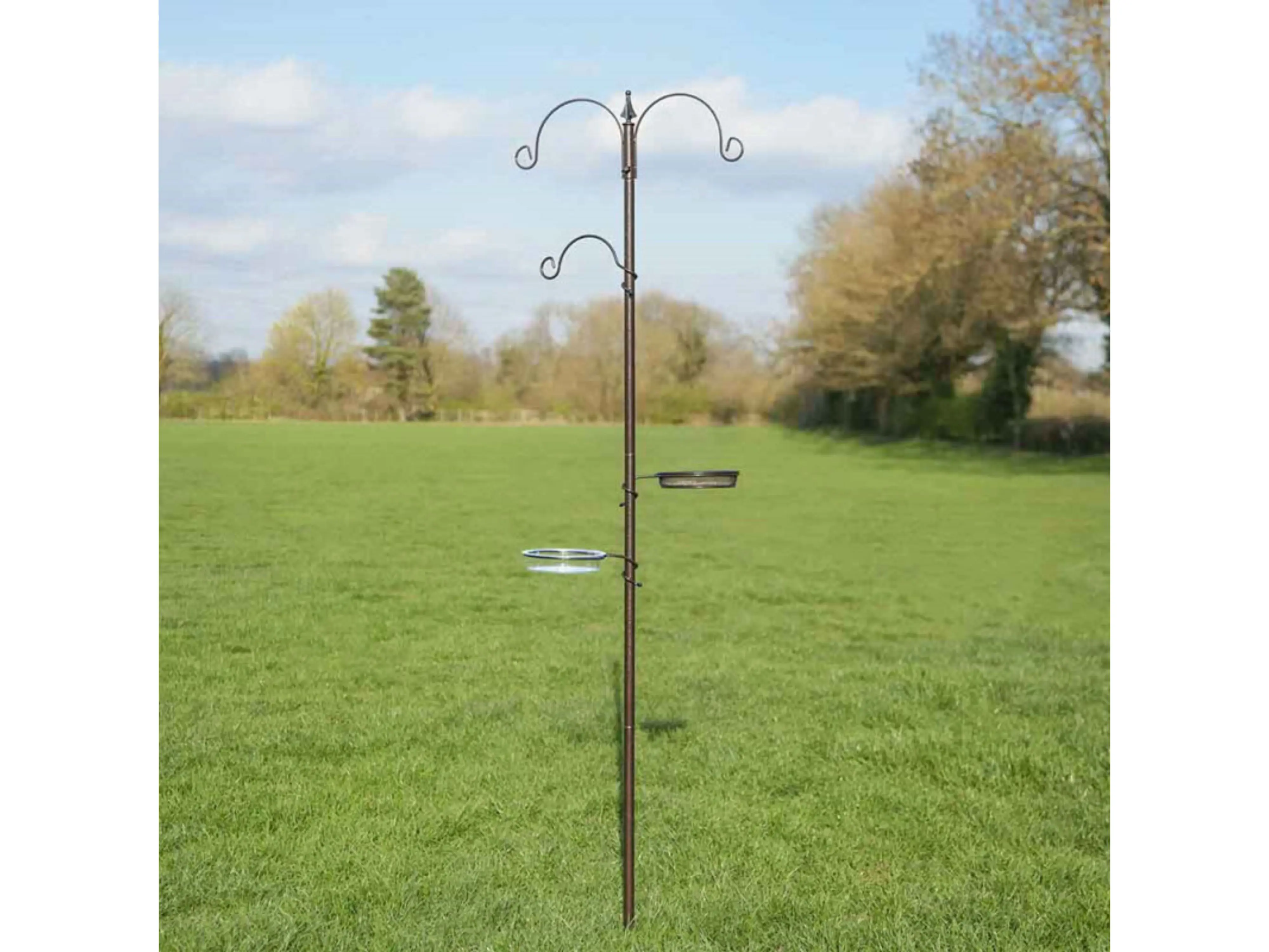 Dit voederstation bestaat bovenaan uit een vaste dubbele voederhaak. Daarbij komen nog eens drie losse verstelbare voederhaken waarvan één met voeder- en één met drinkschaal. Zowel de meegeleverde voeder- als de drinkschaal zijn uitneembaar. Het station bestaat uit drie in elkaar schuifbare antraciet gecoate buizen waarvan één met grondpin.