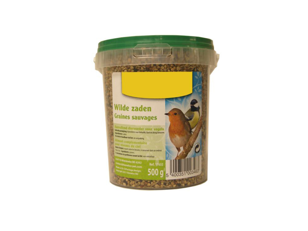 Een mengeling van wilde zaden verpakt in een handige emmer met deksel zodat het voer optimaal kan worden bewaard.
