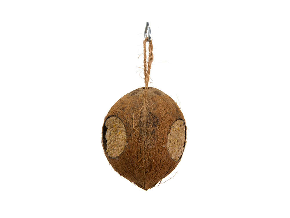 Opgevulde kokosnoot met zaden en vetten. De hangende kokosnoot is voorzien van drie openingen waaruit de vogels deze lekkernij kunnen oppikken.