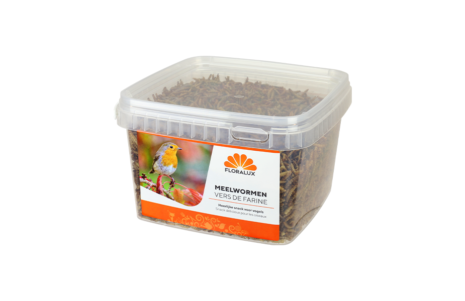 Meelwormen zijn een lekkere traktatie voor onze tuinvogels. Door het hoge eiwit- en vetgehalte zijn ze zeer voedzaam en worden ze bijzonder graag opgenomen.