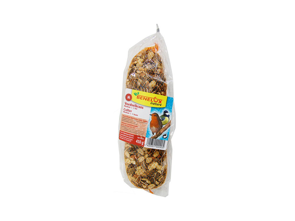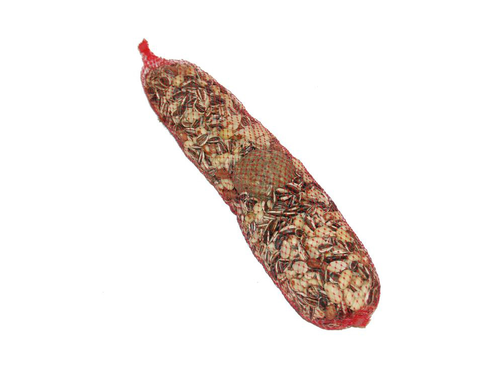 Een voederslinger met een assortiment aan zonnebloempitten, pinda's en vetversnaperingen, gebundeld in een netje. Hang het netje met voeder op een strategische plaats weg van katten en andere predatoren zodat de vogels veilig en makkelijk van het voeder kunnen smullen.
