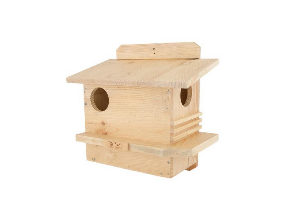 Het eekhoorn woonhuis is aan de zijkant voorzien van een deurtje dat kan worden opengeklapt om het woonhuis te reinigen. Aan de voorzijde en één zijkant is er een plankje voorzien waarop de eekhoorn kan rusten.