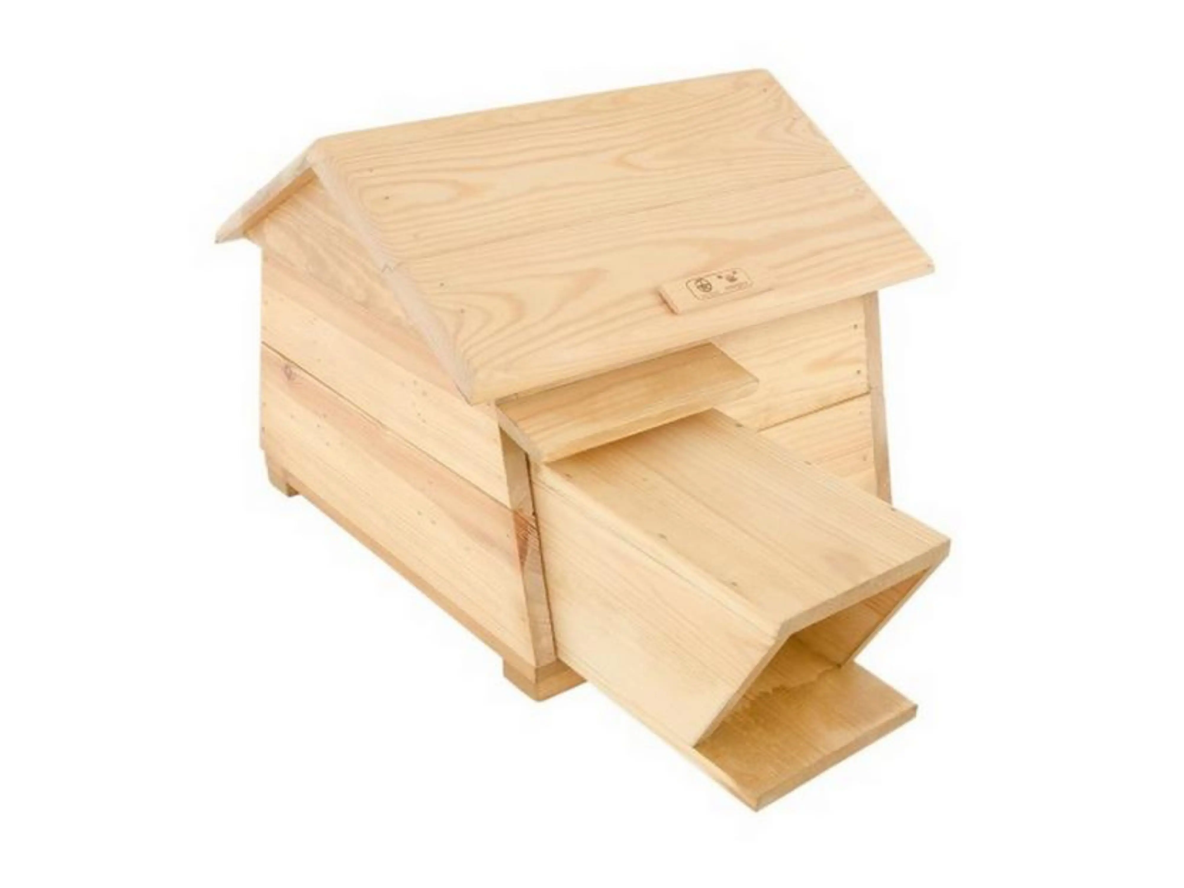 Het woonhuis werd fraai vormgegeven, mooi uitgevoerd in duurzaam hout en afgewerkt met een blanke lak op waterbasis. Het dak is afneembaar zodat je makkelijk het vertrek kan schoonmaken in het voorjaar indien nodig.