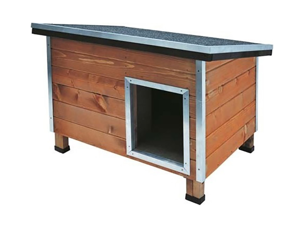 Het hondenhok beschikt over een overkoepelend dak zodat er geen water in het hok of langs de wanden stroomt.