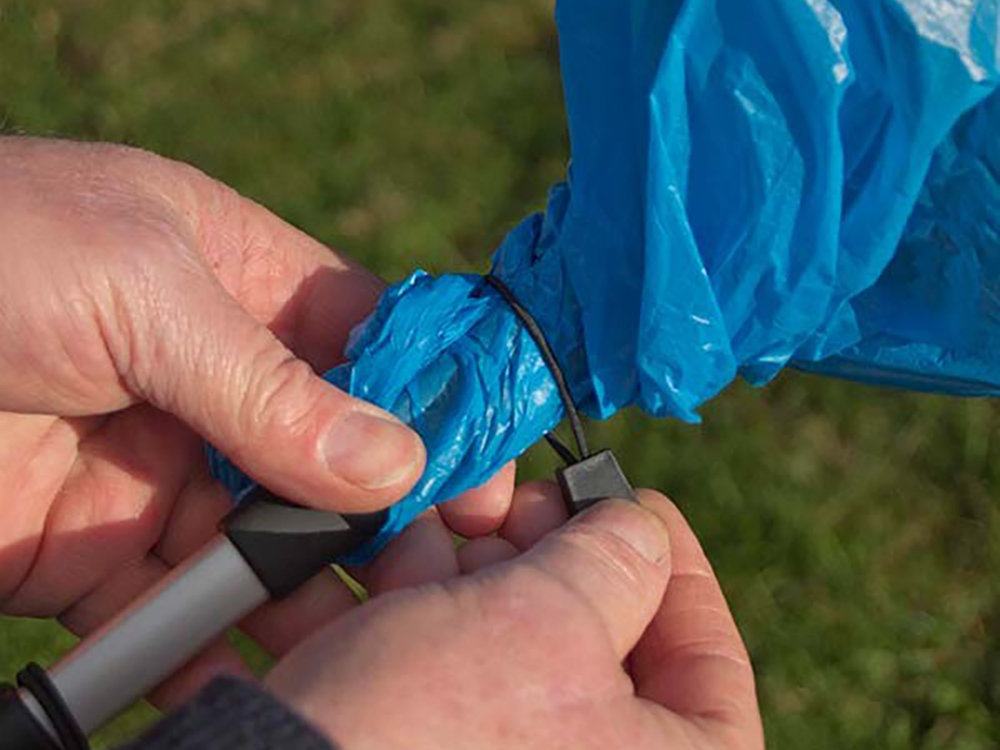 Over het schepje kan je drie zakjes over elkaar aanbrengen. Je vouwt ze over de grijper heen en maakt ze boven de grijper vast met de voorziene rekkertjes. Wanneer je de hondenpoep verwijdert, kan je dankzij het doordachte design, meerdere hoopjes opnemen. Eenmaal het schepje vol is, kan je door de trigger aan het handvat te blokkeren de grijper gesloten houden terwijl je het eerste zakje losmaakt en dichtknoopt. Nadien deblokkeer je de trigger en het zakje kan zonder dat je het ooit hebt aangeraakt de vuilnisbak in. Er zijn nu nog steeds twee zakjes op de grijper aanwezig voor later gebruik.