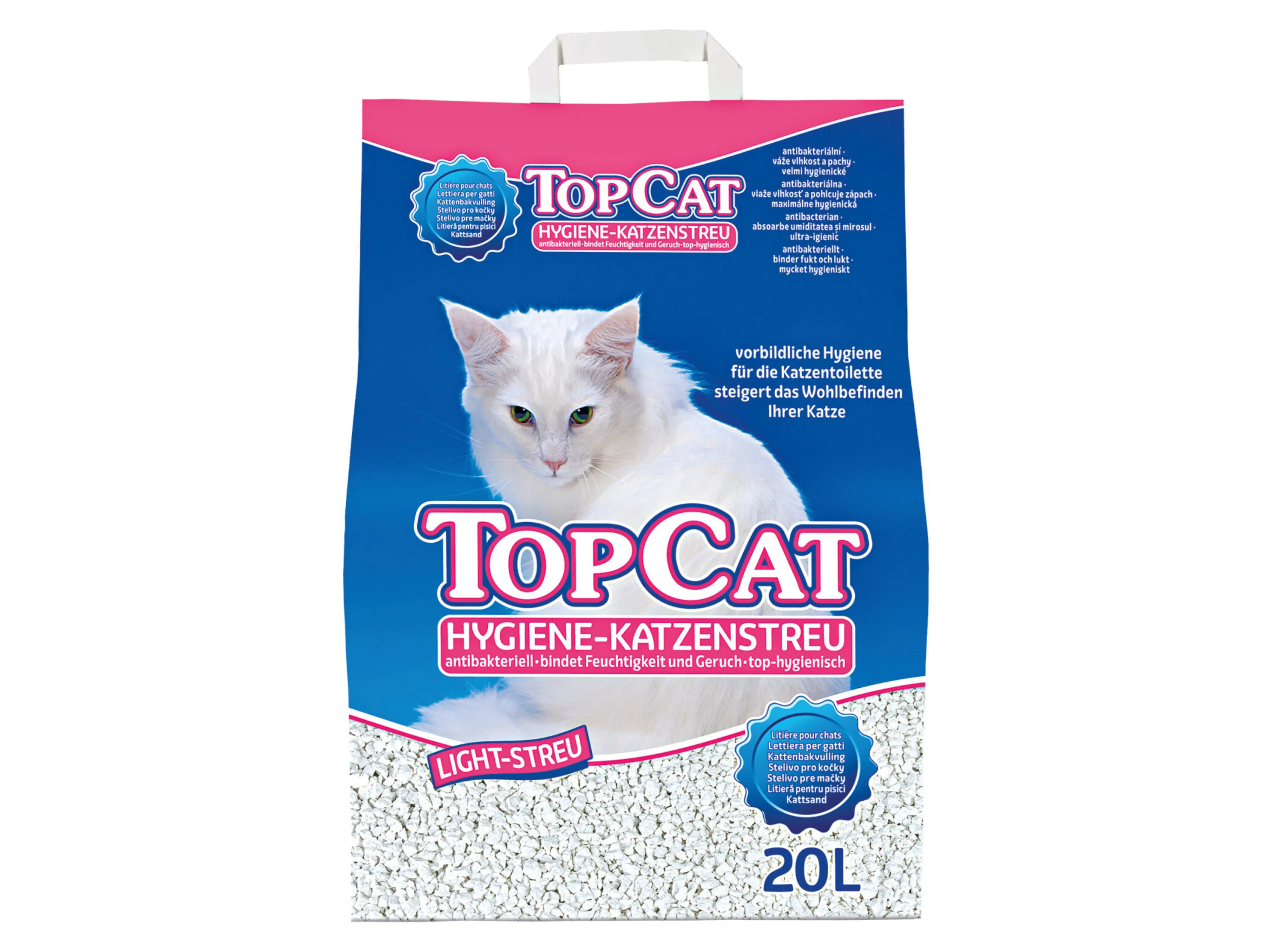 Kattenbakvulling TopCat is licht in gewicht en zeer goed absorberend. Topcat bestaat uit witte natuurlijke minirale korrels. Deze voordelige kattenbakvulling absorbeert het vocht snel, gaat geurhinder tegen en remt de ontwikkeling van bacteriën af.