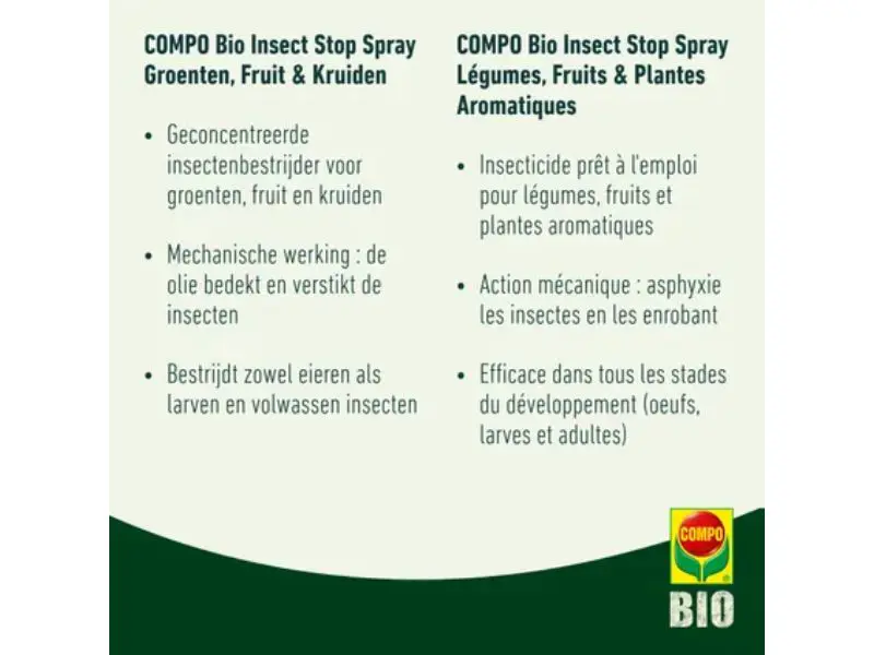 Compo Bio Insect Stop werkt op basis van koolzaadolie, een natuurlijke en hernieuwbare grondstof. De spray legt een dun laagje over de insecten, waardoor ze verstikken. Hierdoor worden alle stadia van het insect aangepakt: van eitje tot larve en volwassen dier. Door deze werking ontstaat er geen resistentie en blijft het product doeltreffend.
