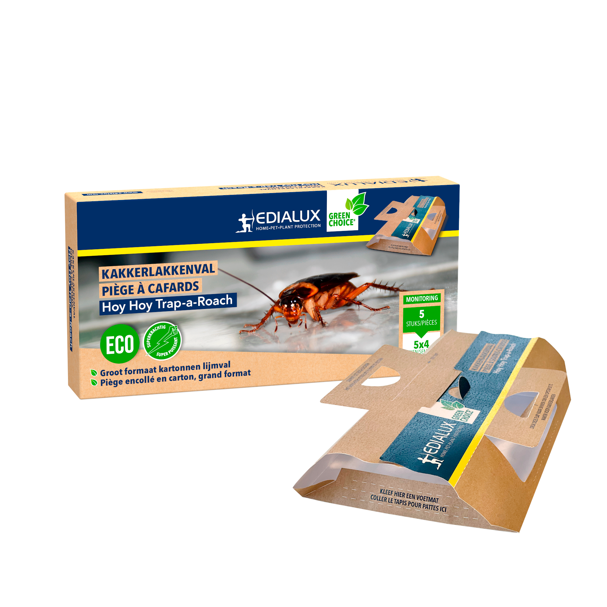 Kakkerlakken bestrijden kan eenvoudig met de Hoy Hoy kakkerlakkenval van Edialux. De kartonnen lijmvallen bevatten een lokstof op basis van natuurlijke producten. De vallen zijn volledig gifvrij en geuren niet. Ze worden gebruikt als monitoring en bevatten geen biocide.