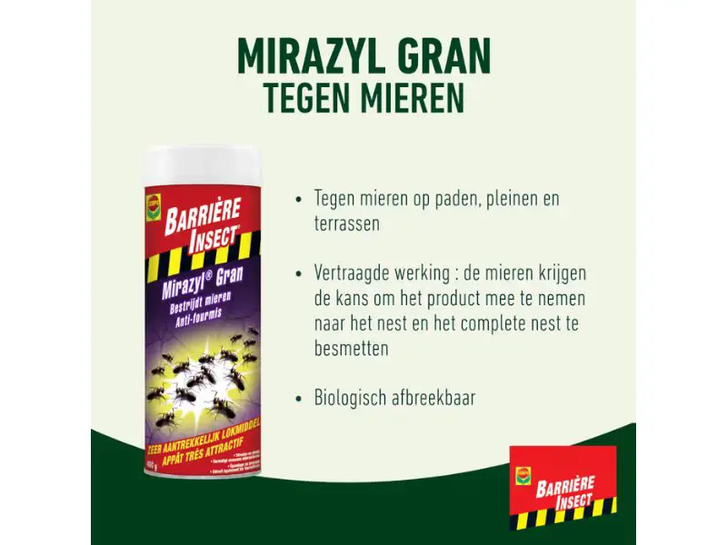 Barrière Insect Mirazyl® Gran is een stofvrij lokmiddel in de vorm van een granulaat, gebaseerd op suiker. Dankzij de sterke aantrekkingskracht van het product worden mieren op paden, pleinen en terrassen vlug en efficiënt bestreden.