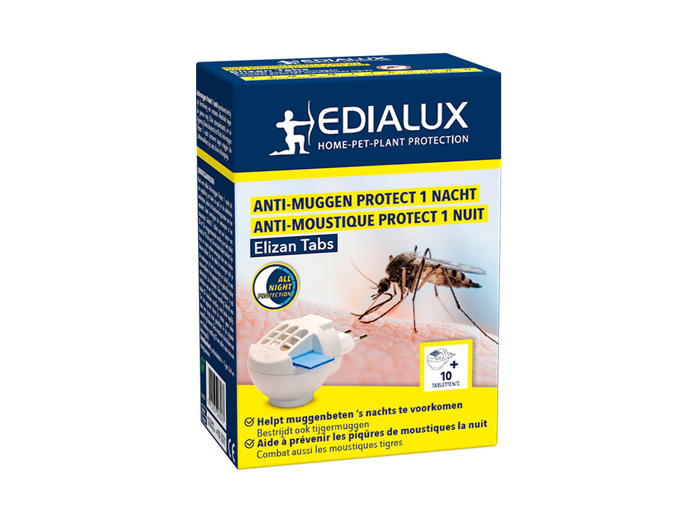 Met de Elizan Protect Tabs blijf je binnenshuis beschermd tegen de gewone mug en de tijgermug. De elektrische stekker kan zowel gebruikt worden met tabletten (één per nacht, werkingsduur van 10 uur) of een verdamper (werkingsduur 45 nachten van 8 uur).