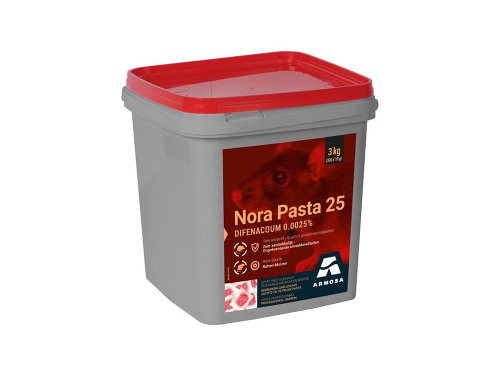 Nora Pasta 25 verdelgt alle ratten en muizen, zelfs in de aanwezigheid van andere voedingsmiddelen. Dankzij de (voor het knaagdier) lekkere geur en smaak, zullen de ratten en de muizen de voorkeur geven aan deze pasta en het andere beschikbare voedsel links laten liggen. Het rattenvergif is goed vochtbestendig en kan daardoor zowel binnen (magazijn, zolder, kelder, garage, schuur,...) als buiten in de tuin worden toegepast.