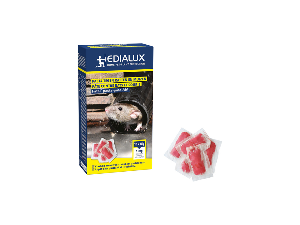 Dit supersterke en deegachtige pasta voor gebruik binnen en buiten is onweerstaanbaar voor muizen en ratten. Het hoge vetgehalte in de Fatal pasta en de heerlijke geur trekt de muizen en ratten aan. Slechts één opname van het gif is fataal voor het ongedierte.
