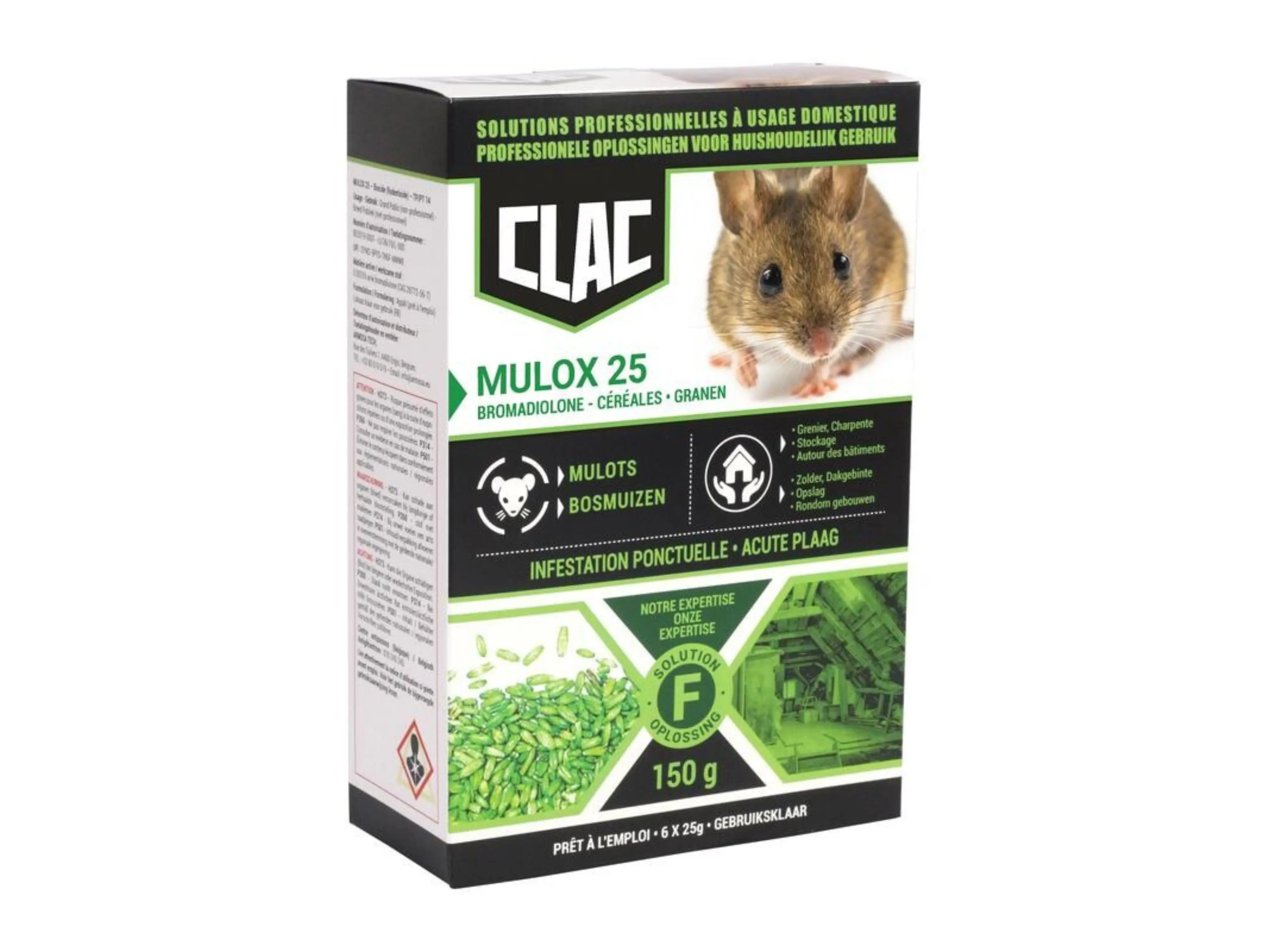 Mulox 25 is een lokaas van gepelde haver, bijzonder aantrekkelijk voor bosmuizen en andere knaagdieren. Het lijkt op hun natuurlijke voedsel, is lekker knapperig en makkelijk op te eten.
