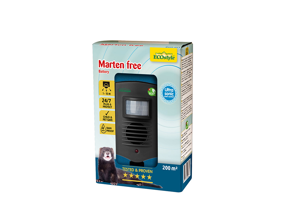 Ecostyle Marten Free beschermt jouw leefomgeving tegen marters. Het verjagen gebeurt met geluid, waardoor een marter het geen fijne leefomgeving vindt en vervolgens vertrekt. Effectief, hygiënisch en zonder gebruik van gif.