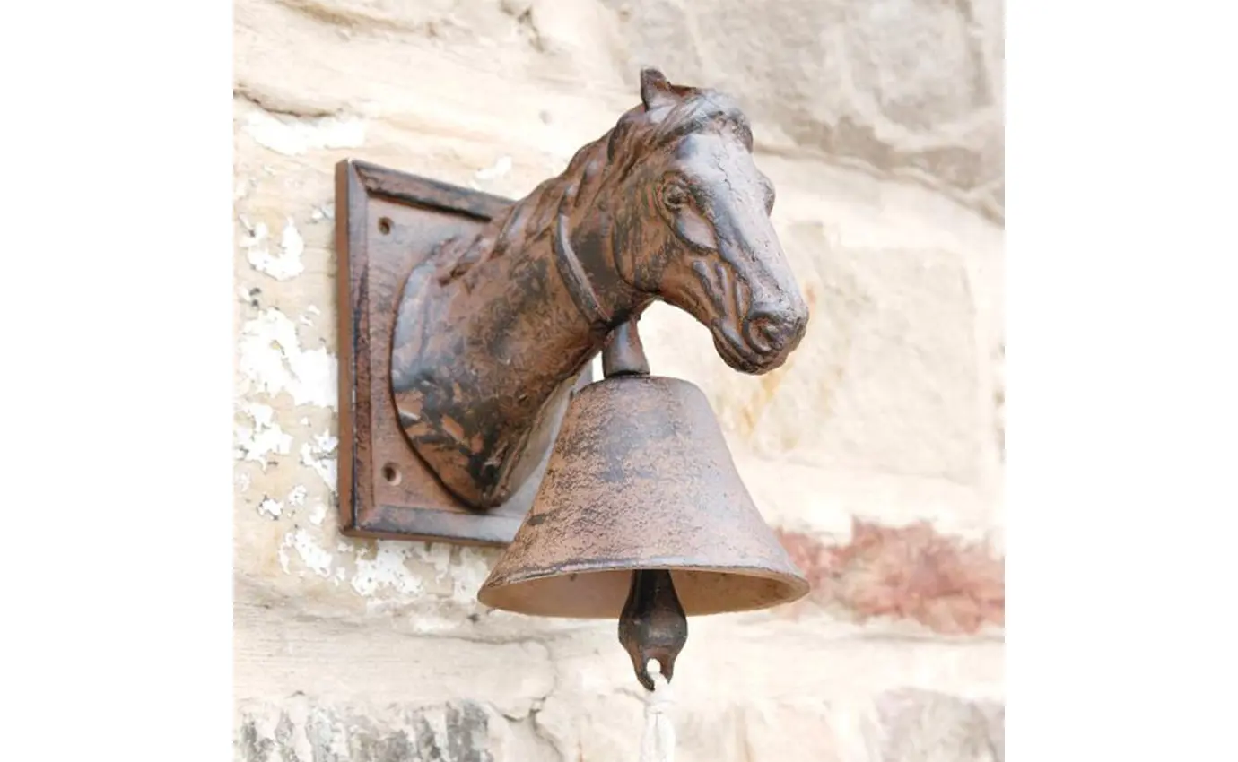Gietijzeren deurbel van Esschert design met een decoratief paardenhoofd, perfect voor elke paardenliefhebber! Het paard draagt een grote bel om zijn nek, waardoor tuingasten zichzelf stijlvol kunnen aankondigen.