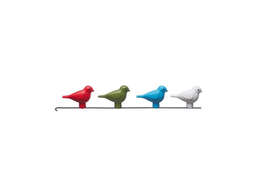 De klok wordt geleverd met 4 gewichten (rood, blauw, zwart en wit) en 4 vogeltjes (rood, groen, blauw en wit) zodat je je klok kan aanpassen aan jouw eigen smaak of interieur.
