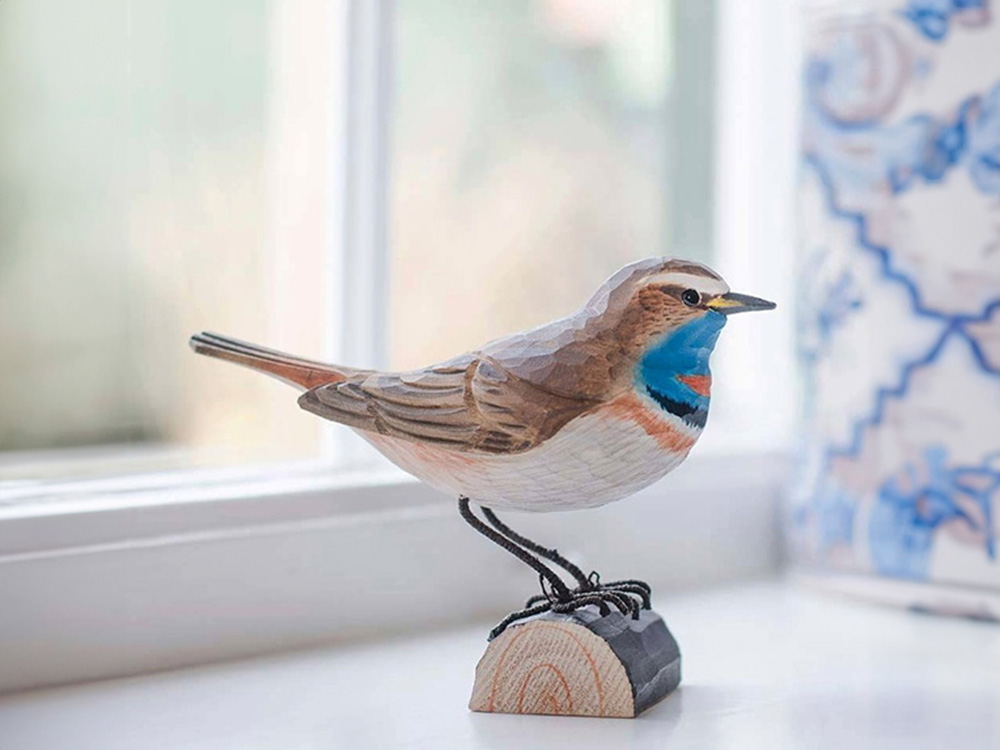 De blauwborst is een trekvogel met een opmerkelijk stemgeluid. Zijn heldere, levendige tonen hebben hem zelfs de bijnaam 'de Noordse nachtegaal, opgeleverd. Deze houten zangvogel is een levensechte weergave van de mannelijke blauwborst. De opvallende blauwe keel met zijn roestrode plek is het belangrijkste kenmerk van deze vogel.