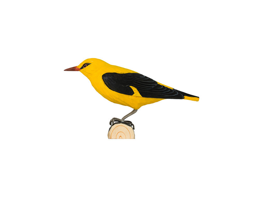 Ambachtelijk vormgegeven houten wielewaal. De wielewaal wordt op ware grootte weergegeven en is beschilderd met milieuvriendelijke verf. Hij rust op een houten tak zodat je hem eender waar in het interieur kan plaatsen.