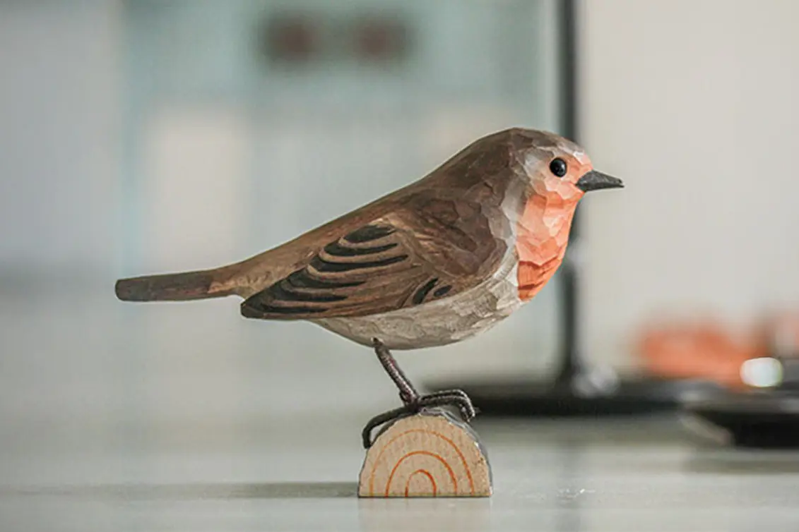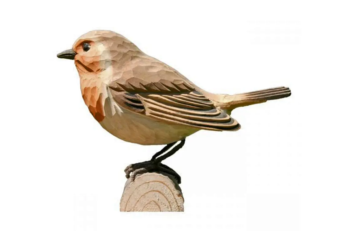 Ambachtelijk vormgegeven houten roodborstje, op ware grootte weergegeven en beschilderd met milieuvriendelijke verf. Dit houten sculptuurtje is een prachtgeschenk voor elke tuinman of tuinvrouw! Er is een stokje voorzien waarmee de vogel ter decoratie in een bloempot gestoken kan worden.