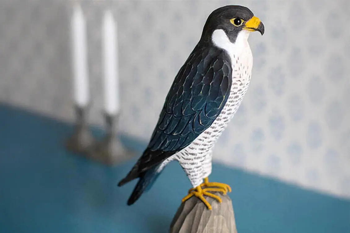 Ambachtelijk vormgegeven houten slechtvalk. De vogel wordt op ware grootte weergegeven en is beschilderd met milieuvriendelijke verf.