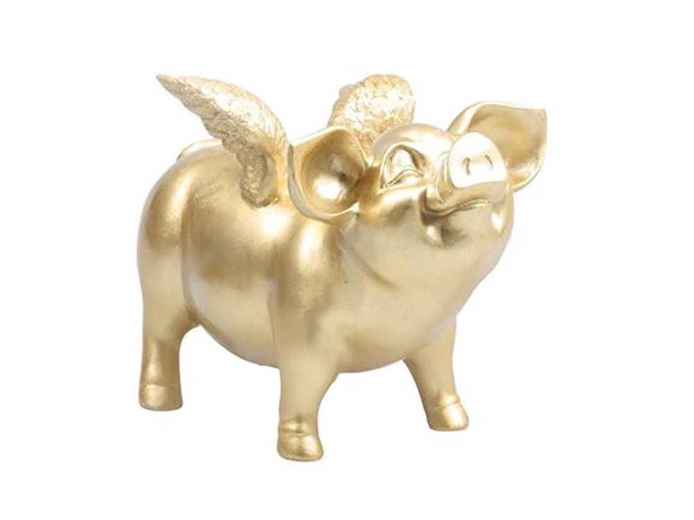 Dit gevleugeld spaarvarken is een opvallende verschijning en springt meteen in het oog. Het varken is gehuld in een glimmend jasje en fleurt het interieur helemaal op.