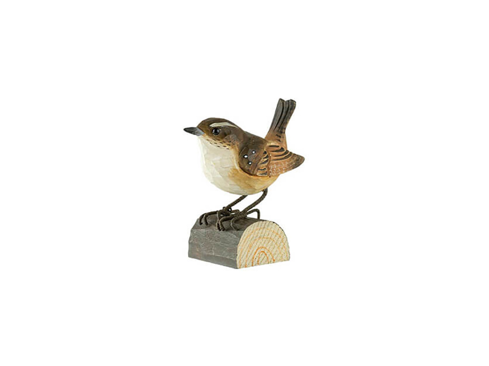 Ambachtelijk vormgegeven houten winterkoninkje. De vogel wordt op ware grootte weergegeven en is beschilderd met milieuvriendelijke verf.
