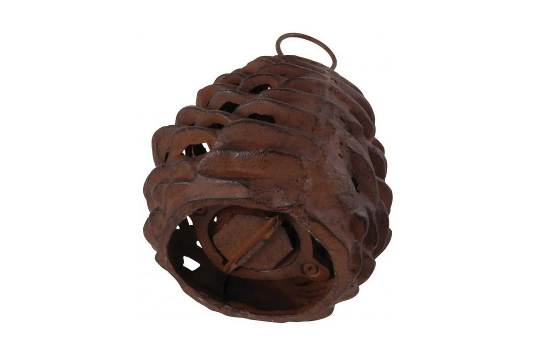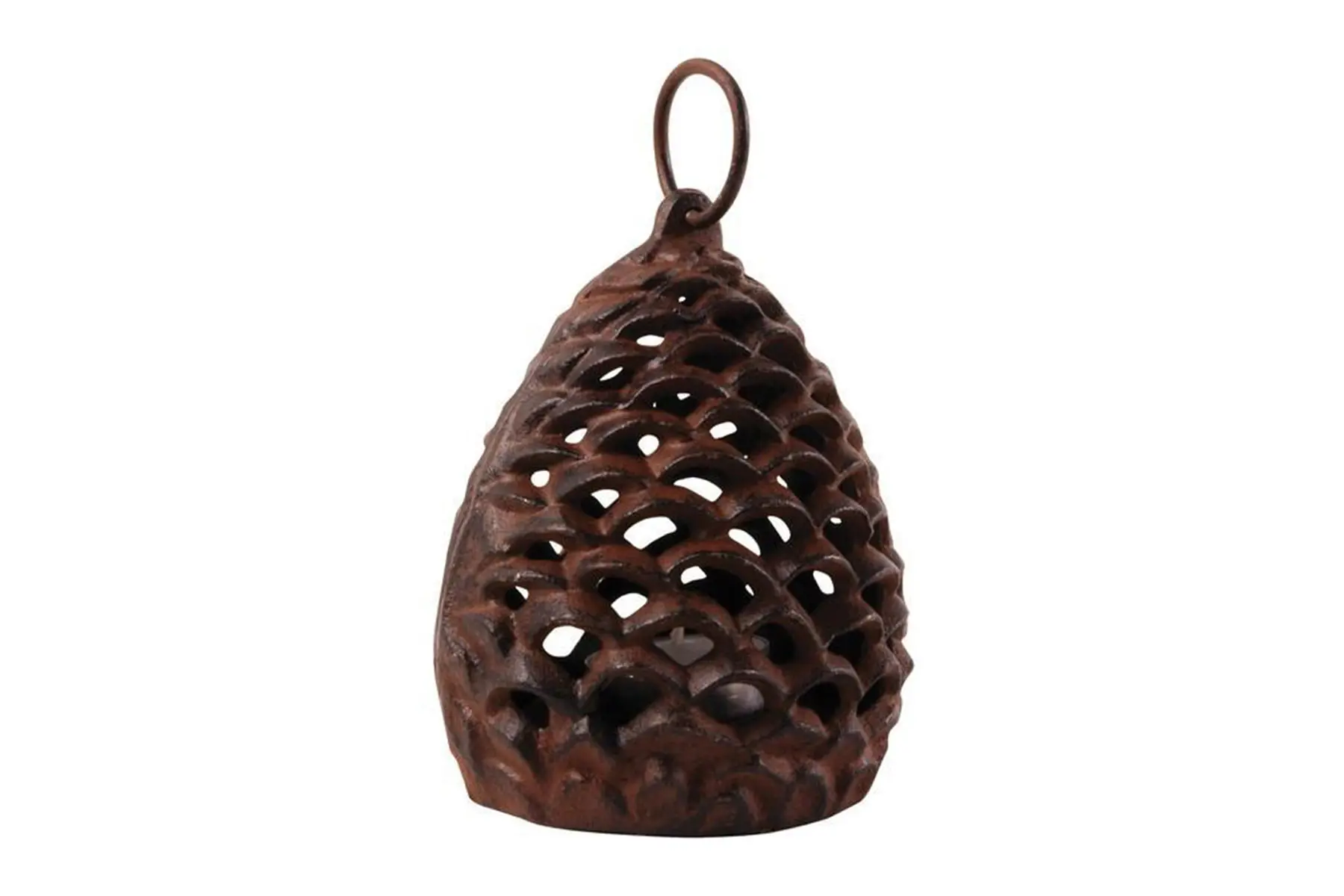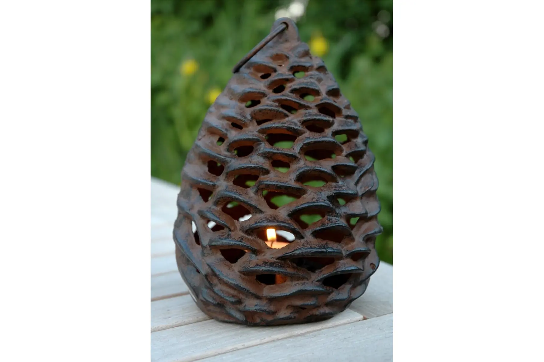 Creëer een betoverende sfeer op je terras, tuintafel of in huis met deze prachtige antiekbruine lantaarn. De gietijzeren theelichthouder, ontworpen als een dennenappel, laat het kaarslicht op een unieke wijze dansen.