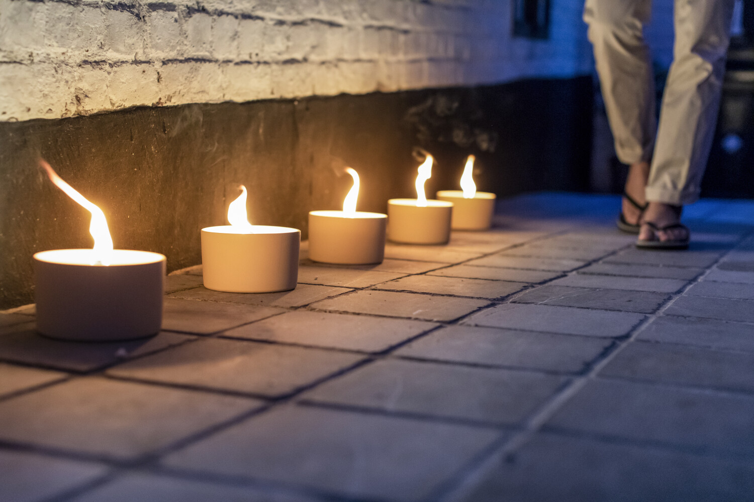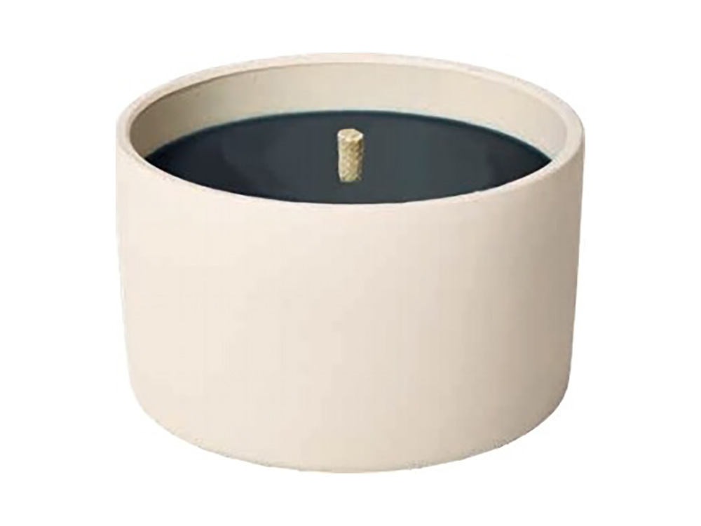De zwarte kaars zit in een strakke, beige kleurige terracotta schaal.