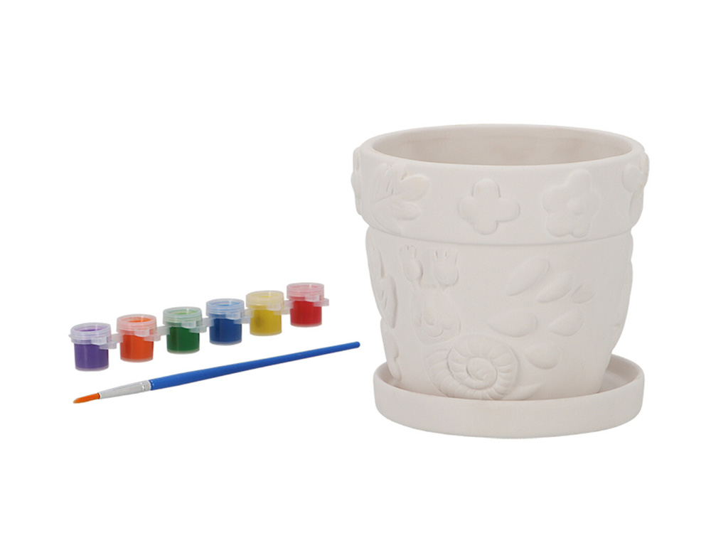 De bloempot komt met een schildersset, compleet met een kwast en zes potjes acrylverf in verschillende vrolijke kleuren. Zo kan je meteen aan de slag gaan! De bloempot is onderaan voorzien van een afwateringsopening zodat het overtollige water weg kan lopen in de onderschaal.