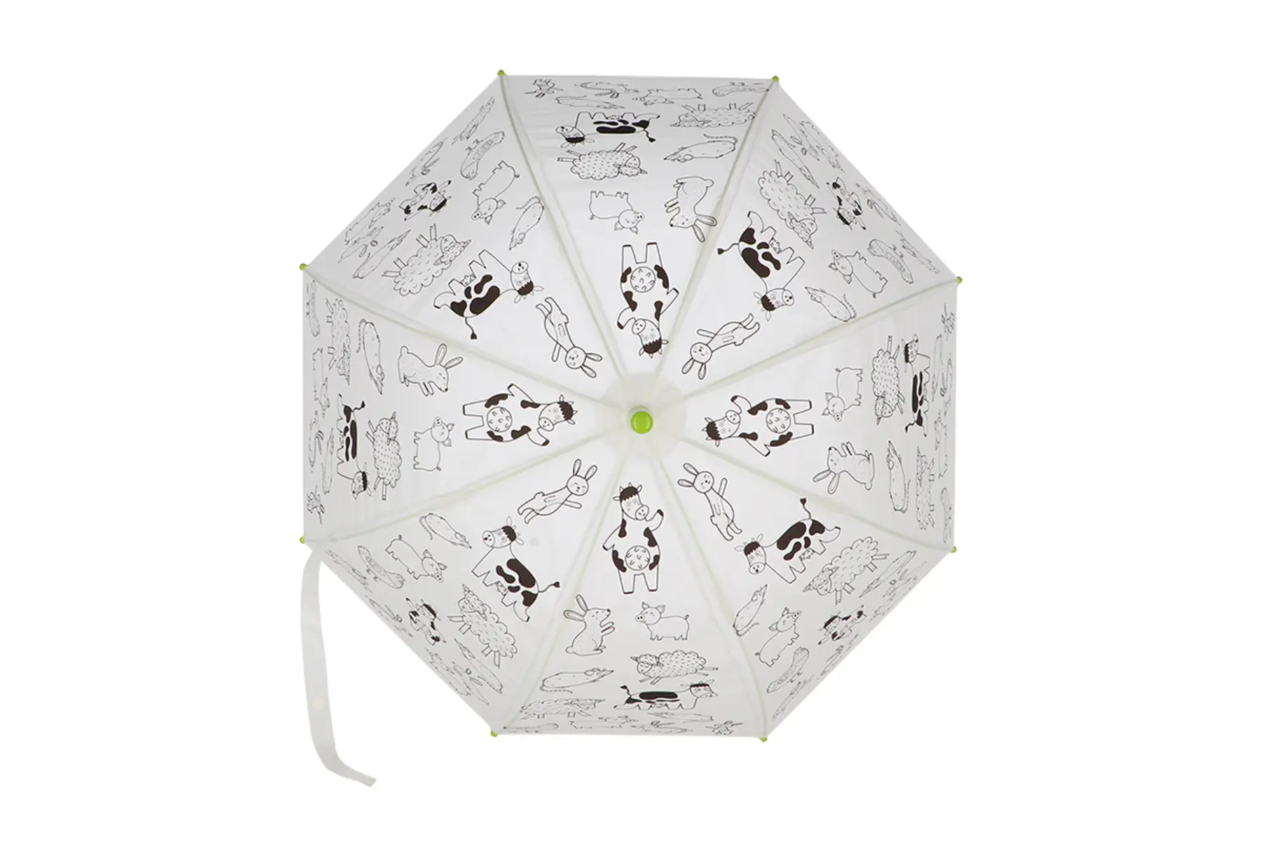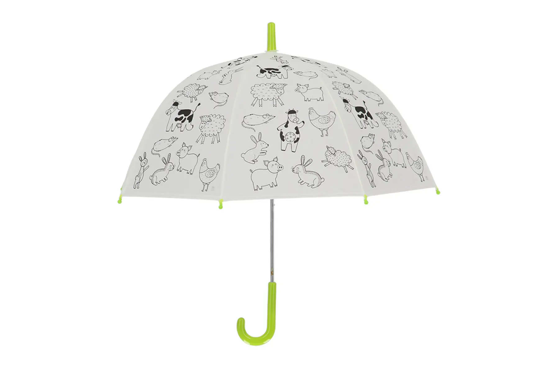 Deze kinderparaplu is bedrukt met silhouetten van verschillende boerderijdieren.