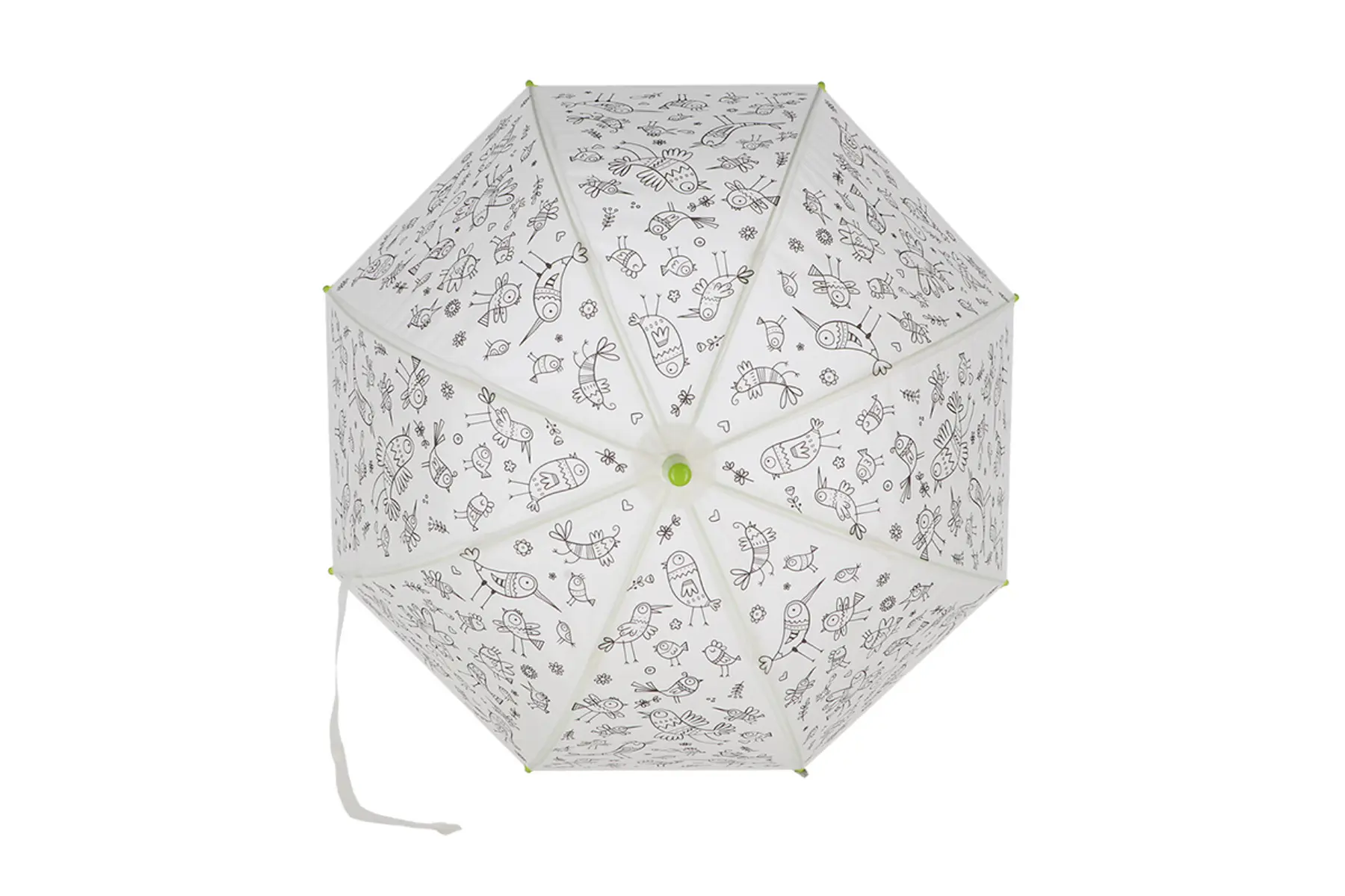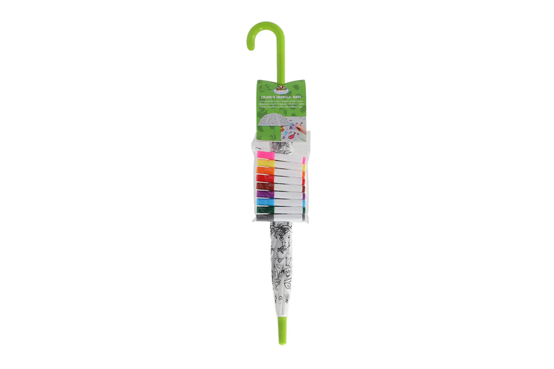 Maak van een regenachtige dag een waar festijn met onze 'Paint it Yourself' paraplu, versierd met allerlei schattige dieren. Deze kinderparaplu kan volledig naar eigen wens ingekleurd worden, want hij wordt geleverd met een set kleurrijke stiften. Zo kunnen kinderen hun eigen meesterwerk creëeren!