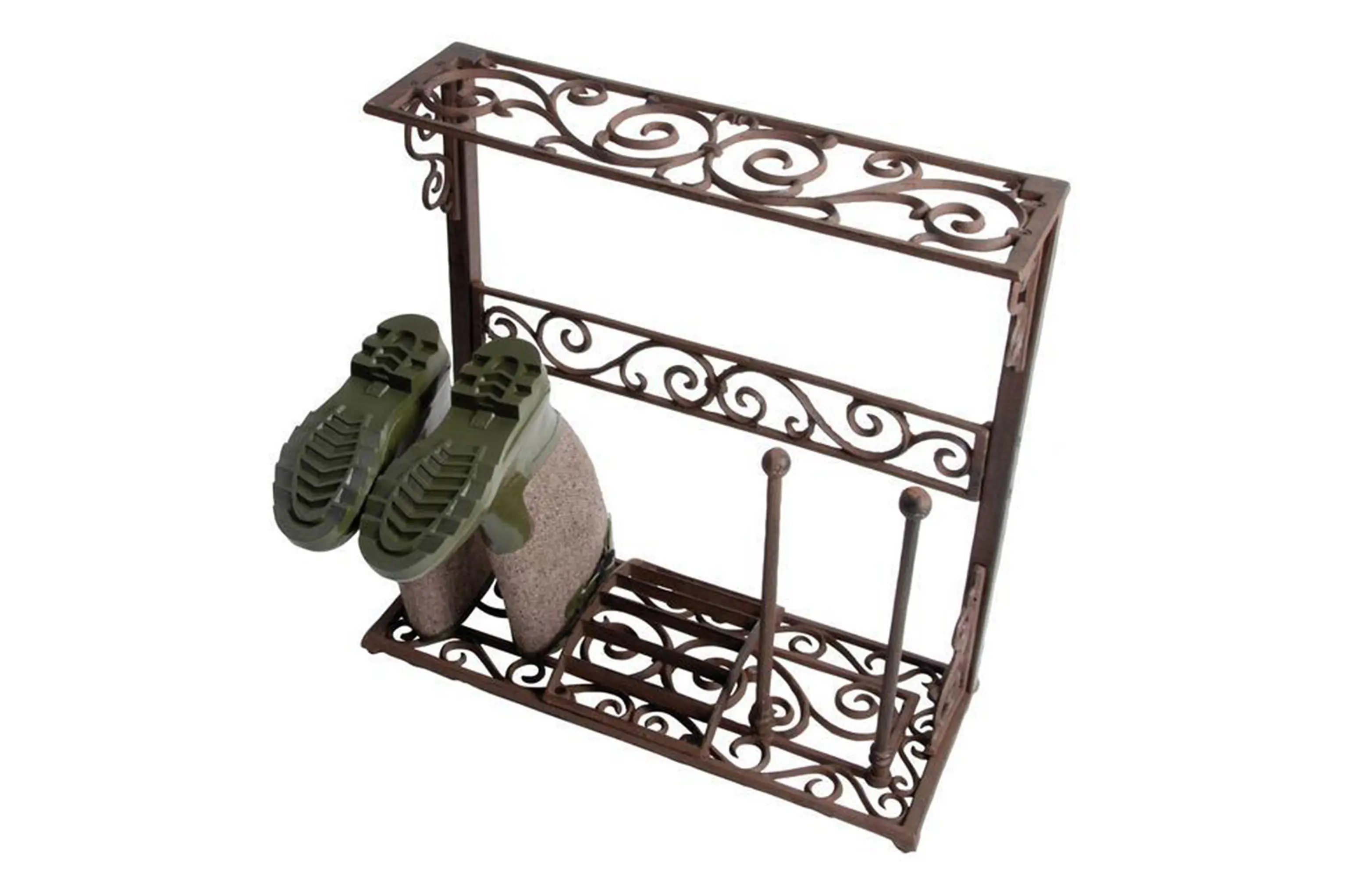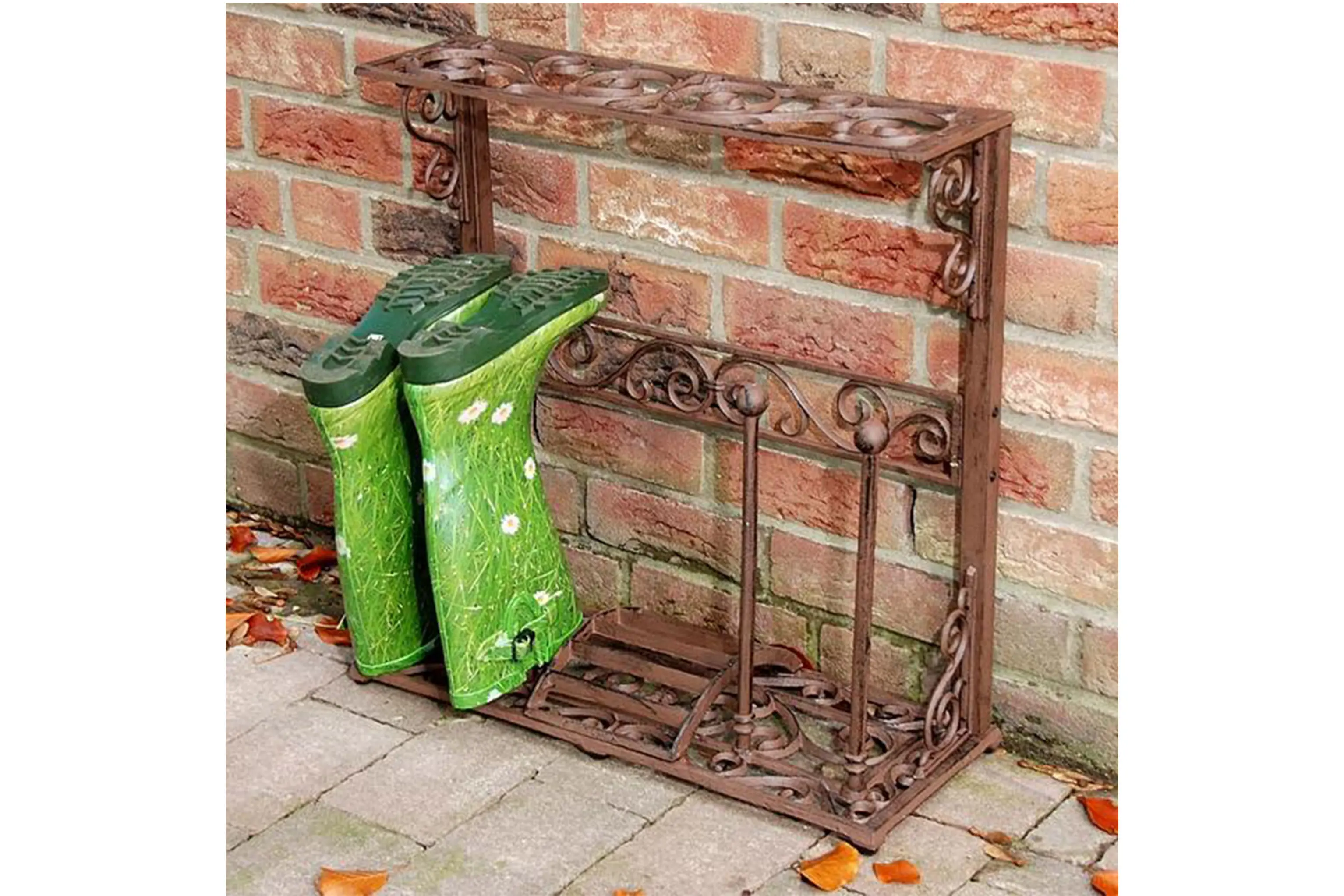Het laarzenrek, gemaakt uit gietijzer, biedt ruimte aan 4 laarzen (2 paar) en is voorzien van een rooster om moeder en vuil van de laarzen af te vegen. Bij dit rek hangen de laarzen op hun kop waardoor het niet in de laarzen kan regenen.