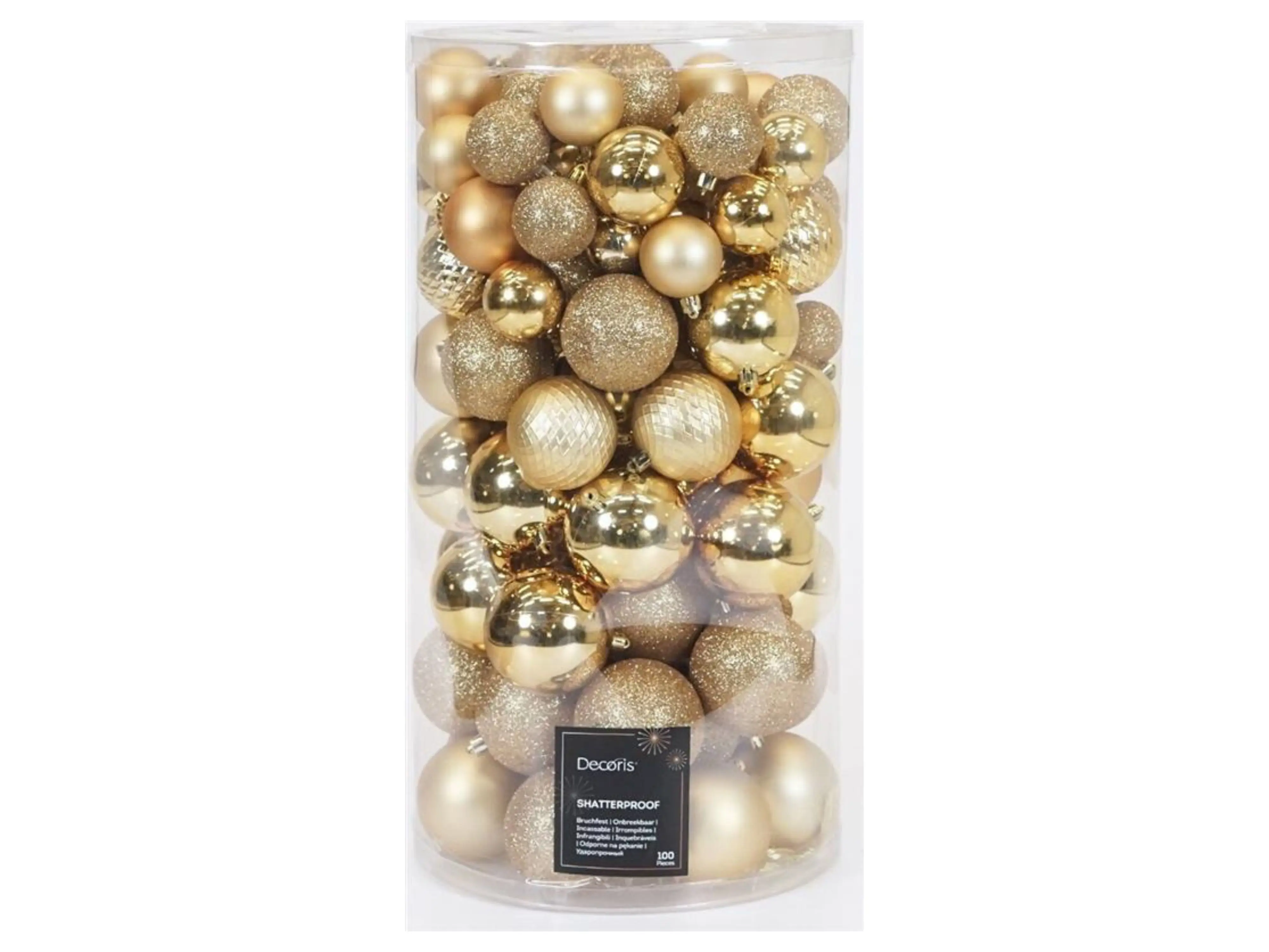 Heb je een grote kerstboom om te versieren? Dan is dit set met 100 kerstballen beslist iets voor jou. Het set bestaat uit een mix van verschillende modellen in een mooie trendy kleur. De glanzende, matte en glitterende kerstballen, en ballen met reliëf worden geleverd in verschillende afmetingen. Ze kunnen ook gebruikt worden om een mooie transparante vaas of een schaal op de feesttafel te vullen.