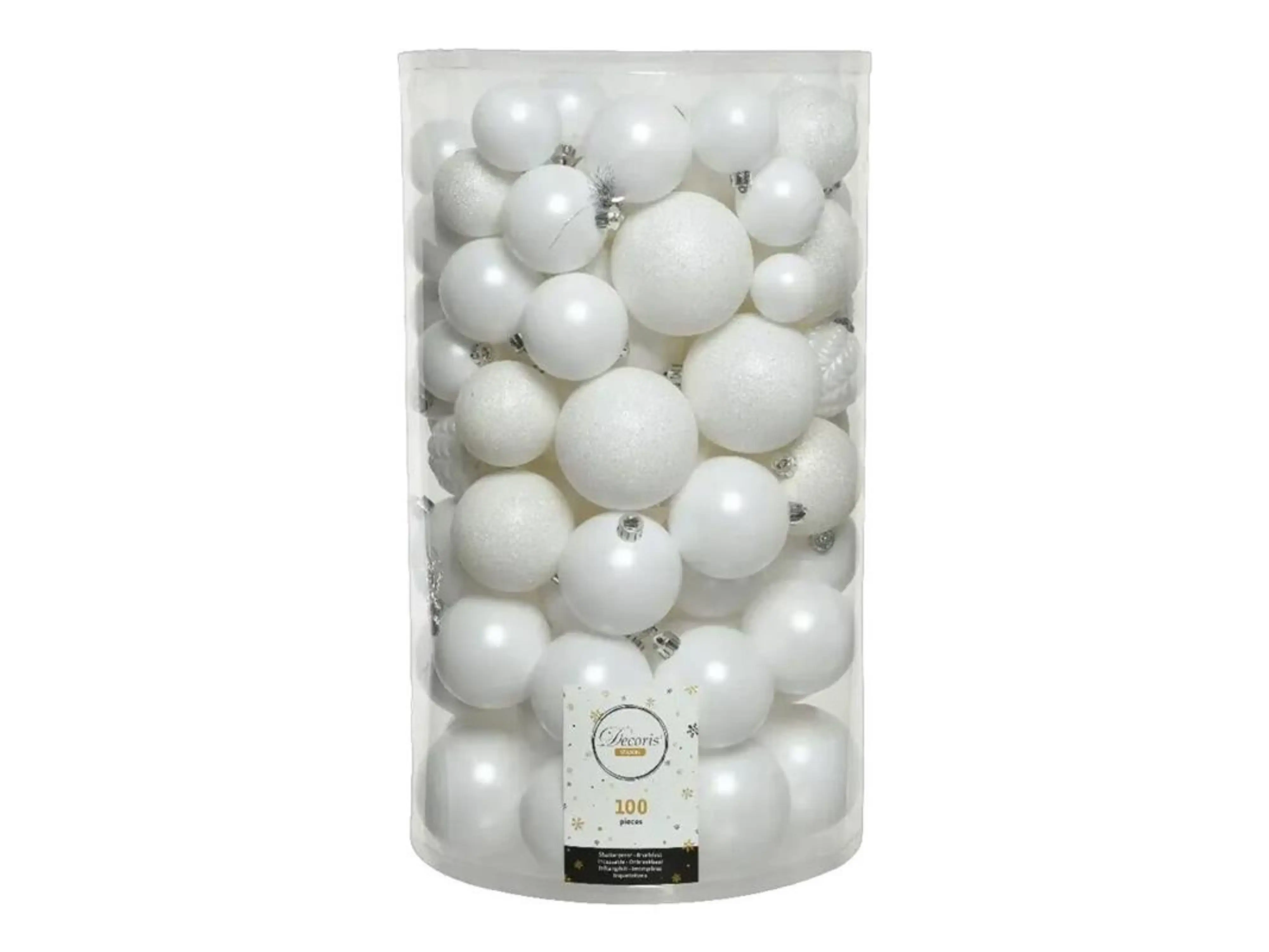 Heb je een grote kerstboom om te versieren? Dan is dit set met 100 kerstballen beslist iets voor jou. Het set bestaat uit een mix van verschillende modellen in een mooie trendy kleur. De glanzende, matte en glitterende kerstballen, en ballen met reliëf worden geleverd in verschillende afmetingen. Ze kunnen ook gebruikt worden om een mooie transparante vaas of een schaal op de feesttafel te vullen.