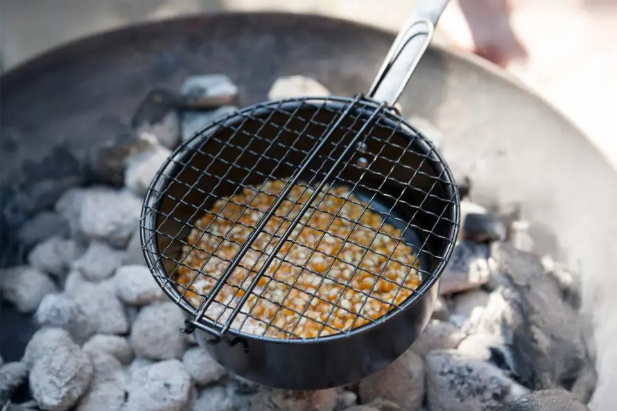 Giet 2 eetlepels olie in de pan en voeg 50 gram maïskorrels toe en vergrendel het deksel. Houd de gesloten pan een drietal cm boven de vlam of kolen en schud de pan van voor naar achter om de maïskorrels te verdelen over de pan. Hierdoor zijn alle maïskorrels mooi omhuld met olie en zullen ze niet bruin worden maar gelijkmatig poppen. Haal de pan van het vuur na een paar minuten als de korrels gestopt zijn met poppen. Gebruik een hittebestendige handschoen voor het openen van het deksel en giet de popcorn in een pan. Voeg er wat boter en zout aan toe naar smaak en geniet van de warme lekkernij!