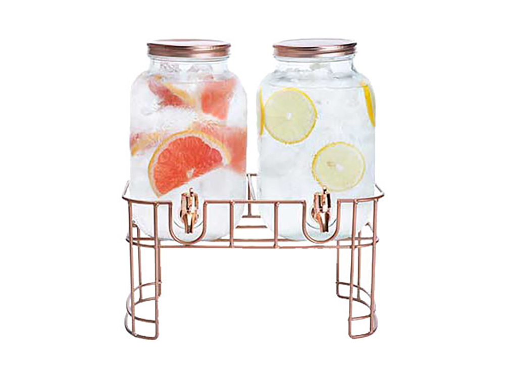 In de twee dispensers kan je verschillende dranken aanbieden: vruchtensap, frisdrak, wijn, water met citroen, ijsthee of sangria. Beide dispensers hebben een inhoud van 3 liter en zijn afgewerkt met een deksel en tapkraan in rosé goud. Dankzij de verhoogde voet staan de dispensers stevig op de tafel en kunnen de glazen vlot worden bijgevuld.