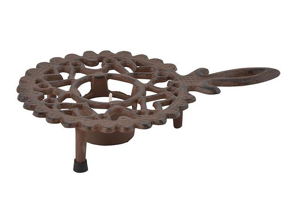 Deze schotelverwarmer in Victoriaanse stijl van Esschert design werd met de hand gegoten in gietijzer en is voorzien van een stevig handvat. Onder het rooster is een houder voorzien waar een theelichtje in past.