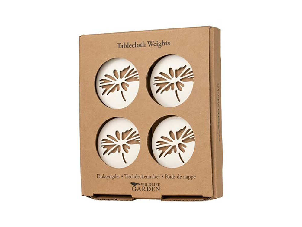 De gewichtjes met een geperforeerd madeliefjespatroon zijn gemaakt van staal en worden vastgehouden aan de achterkant van het tafelkleed met een zwarte magneet.