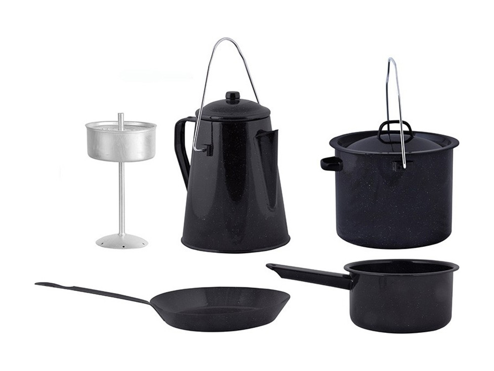 De set is licht in gewicht en dus makkelijk om mee te nemen. De 4-delige set bestaat uit een koekenpan, een steelpan, een kookpan met deksel en een koffiepot/percolator.