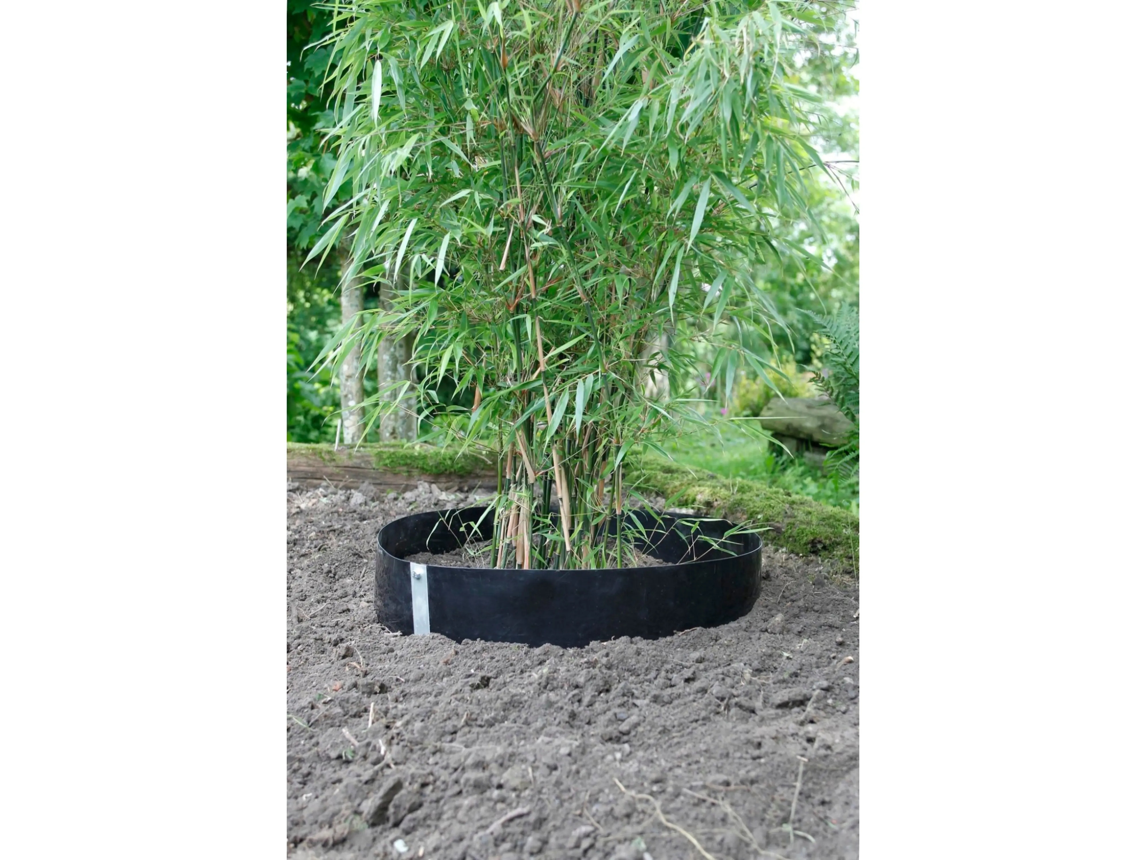 De 1 mm dikke begrenzer is gemaakt van duurzaam HDPE (High Density Polyethyleen) en wordt geleverd met een aluminium afsluitrail. Met deze afsluitrail zet je de beide uiteinden van de wortelbegrenzer stevig aan elkaar dankzij de 4 forse bouten. Zo krijgt de bamboe geen kans om zich uit de begrenzer te groeien.