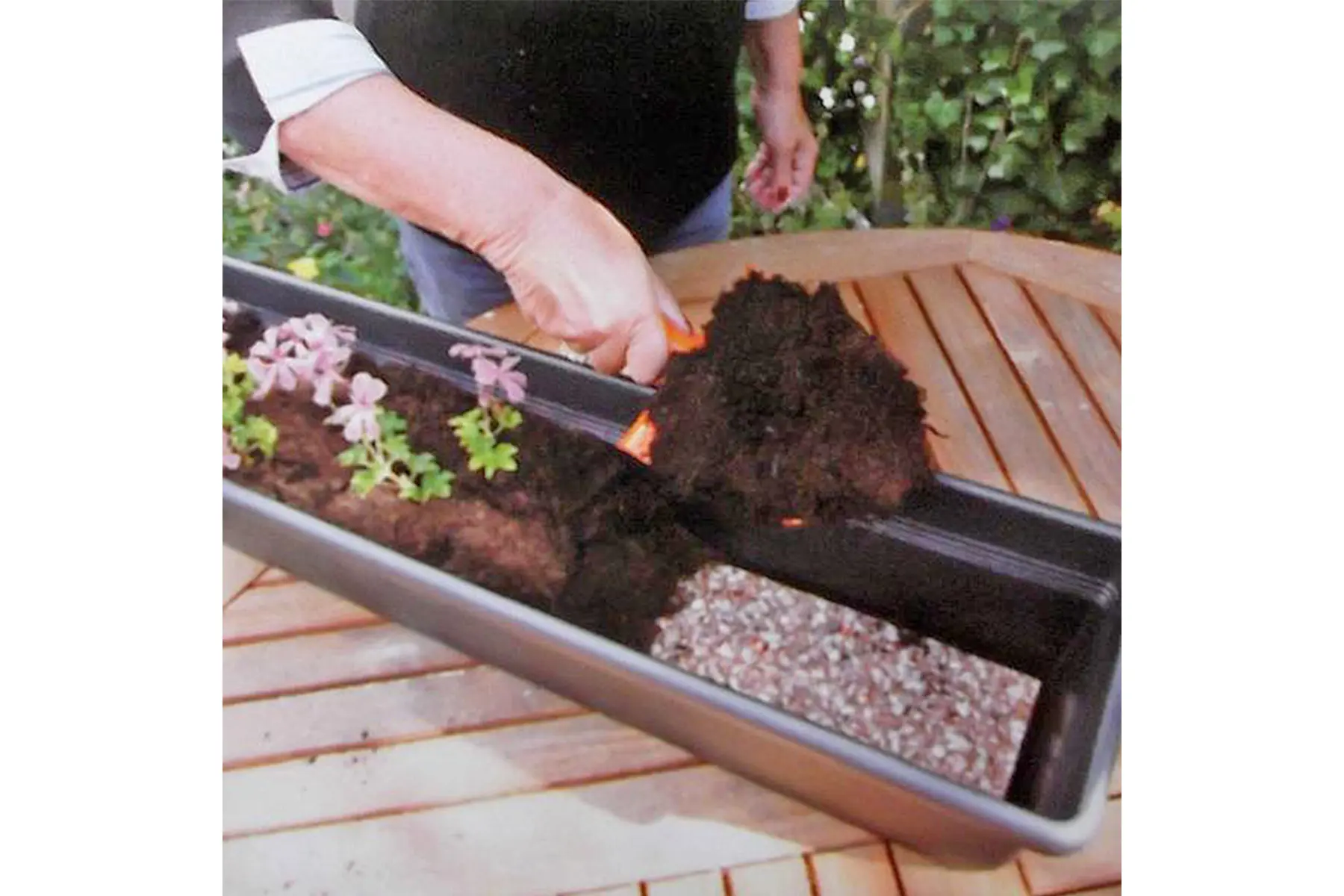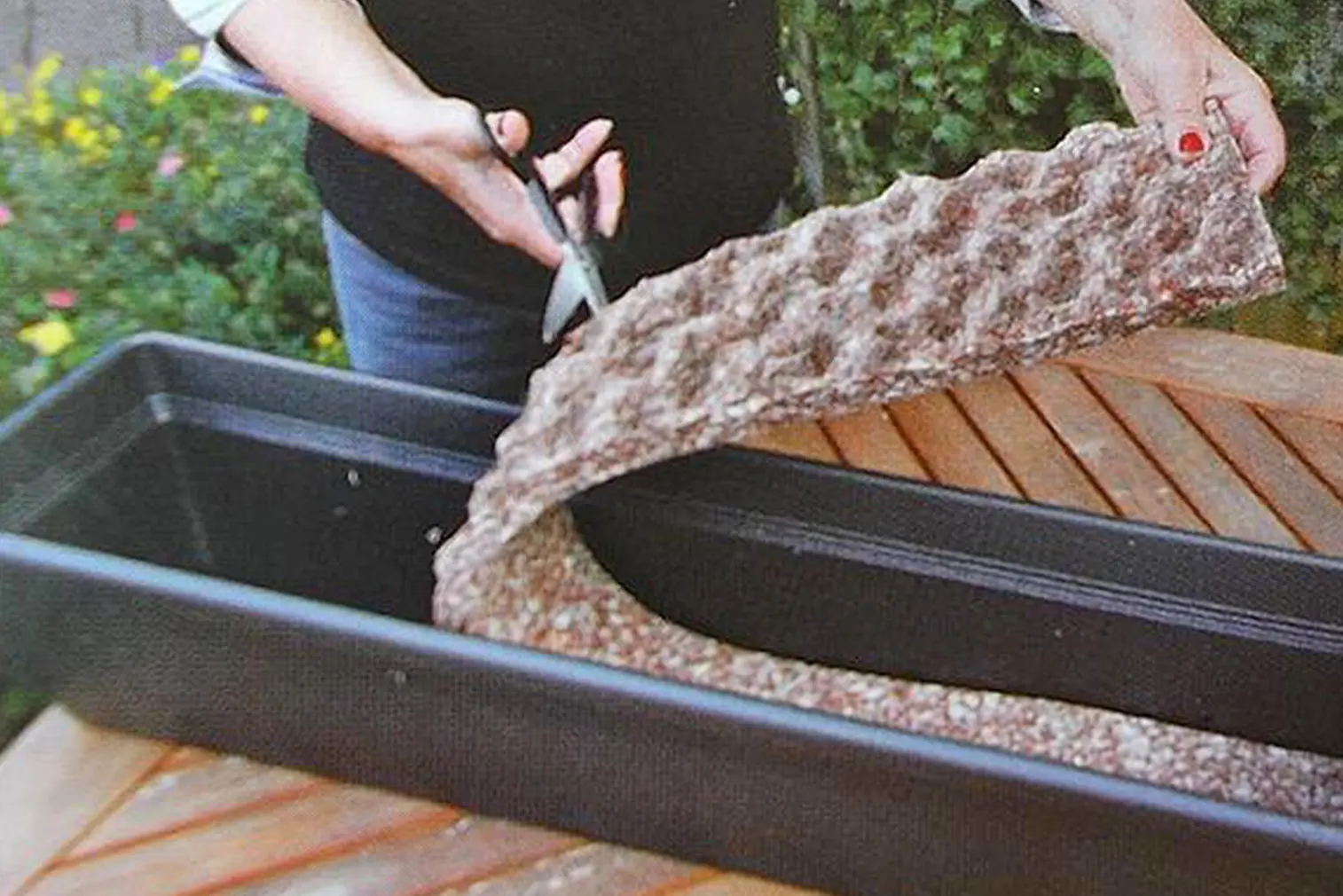 Plaats de waterabsorptiemat op de bodem van de bloembak met de toppen naar onderen gericht. Daarbovenop komen de potgrond en de planten.