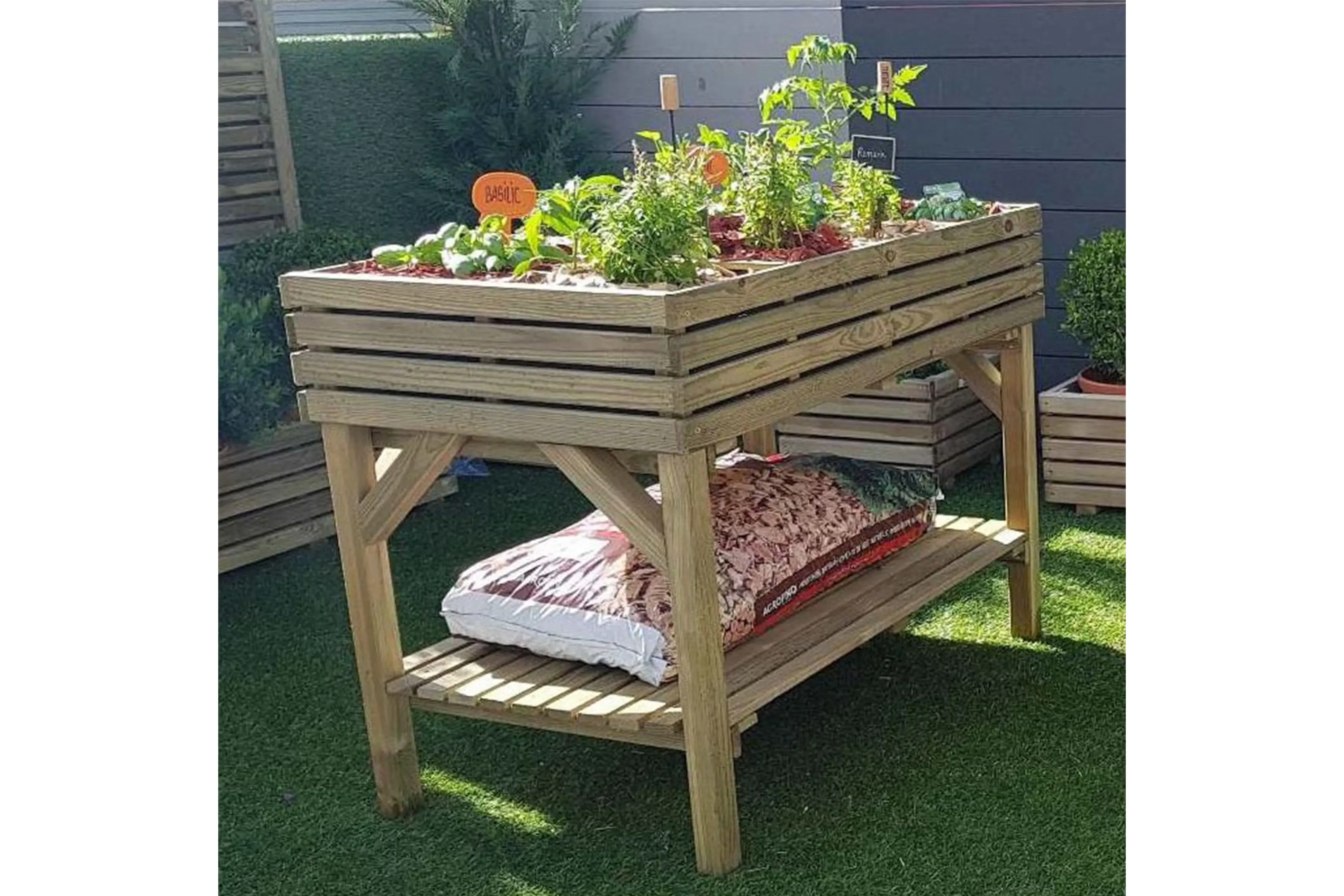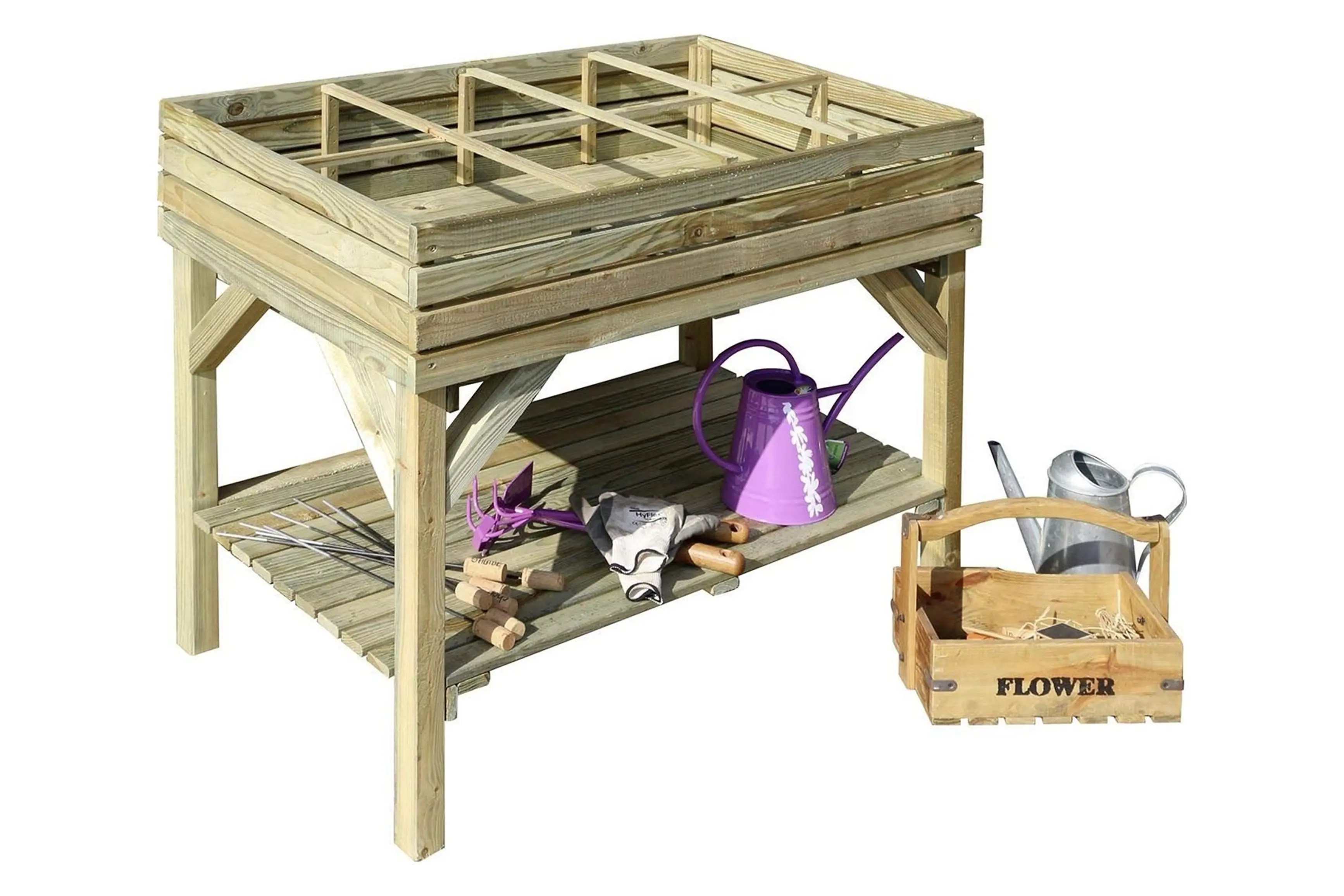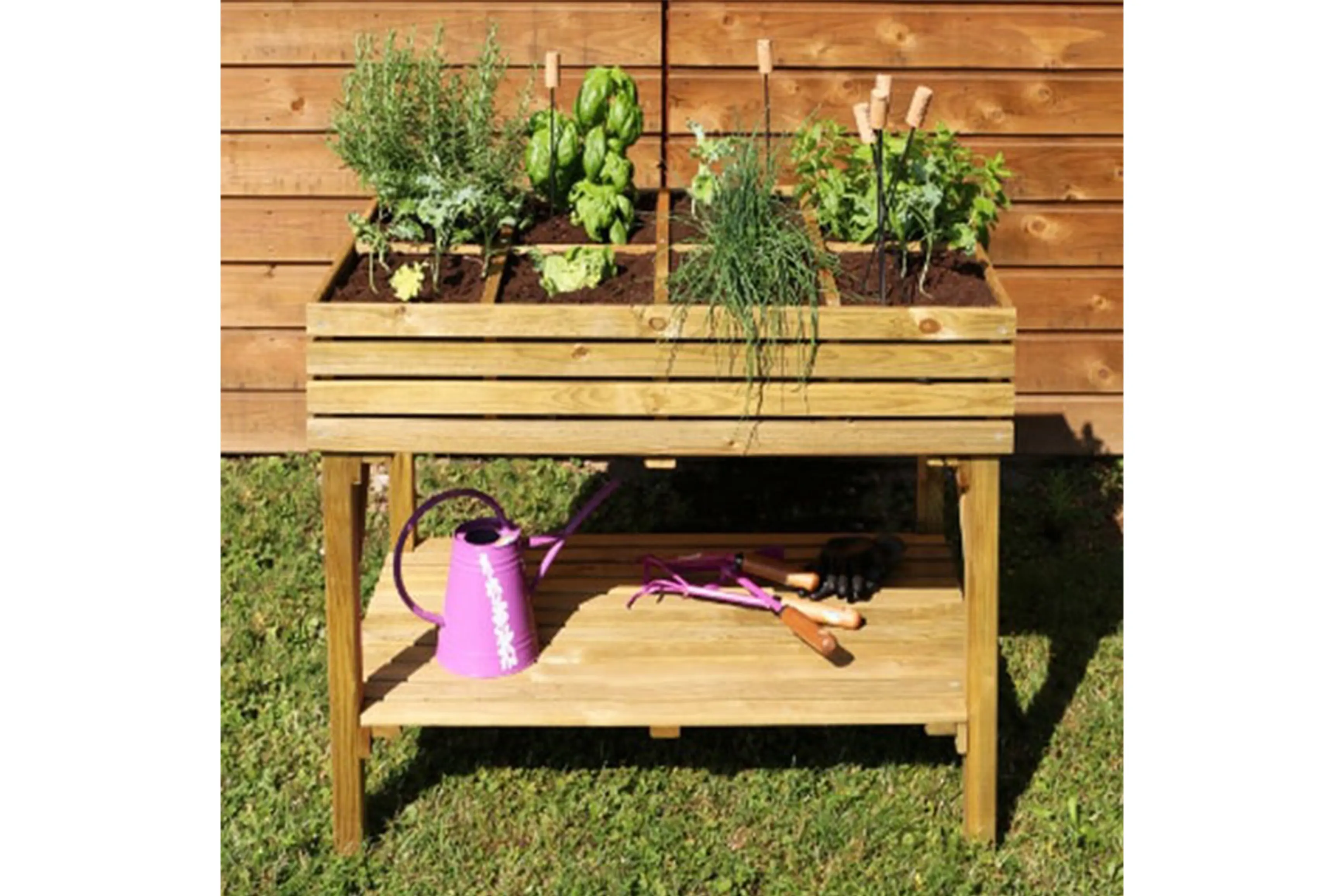 Leuke, zeer stevige verhoogde plantenbak. Uitermate geschikt voor tuinkruiden, groenten,...! Deze moestuintafel heeft 8 compartimenten van 22 bij 27 cm die samen goed zijn voor een inhoud van 108 liter. Onder de plantenbak is er een legboord voorzien om tuinspullen op te bergen.