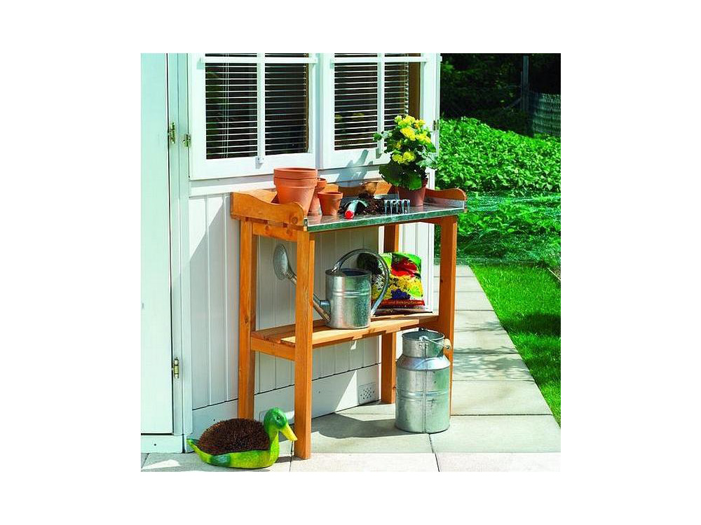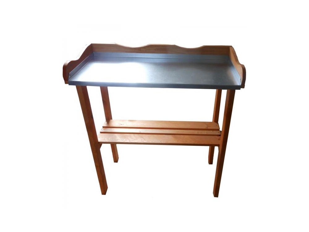 Houten oppottafel met verzinkt werkblad. Deze stevige praktische oppottafel is gemaakt uit duurzaam geïmpregneerd grenenhout. Het hout heeft een honingbruine kleur en is goed weerbestendig.