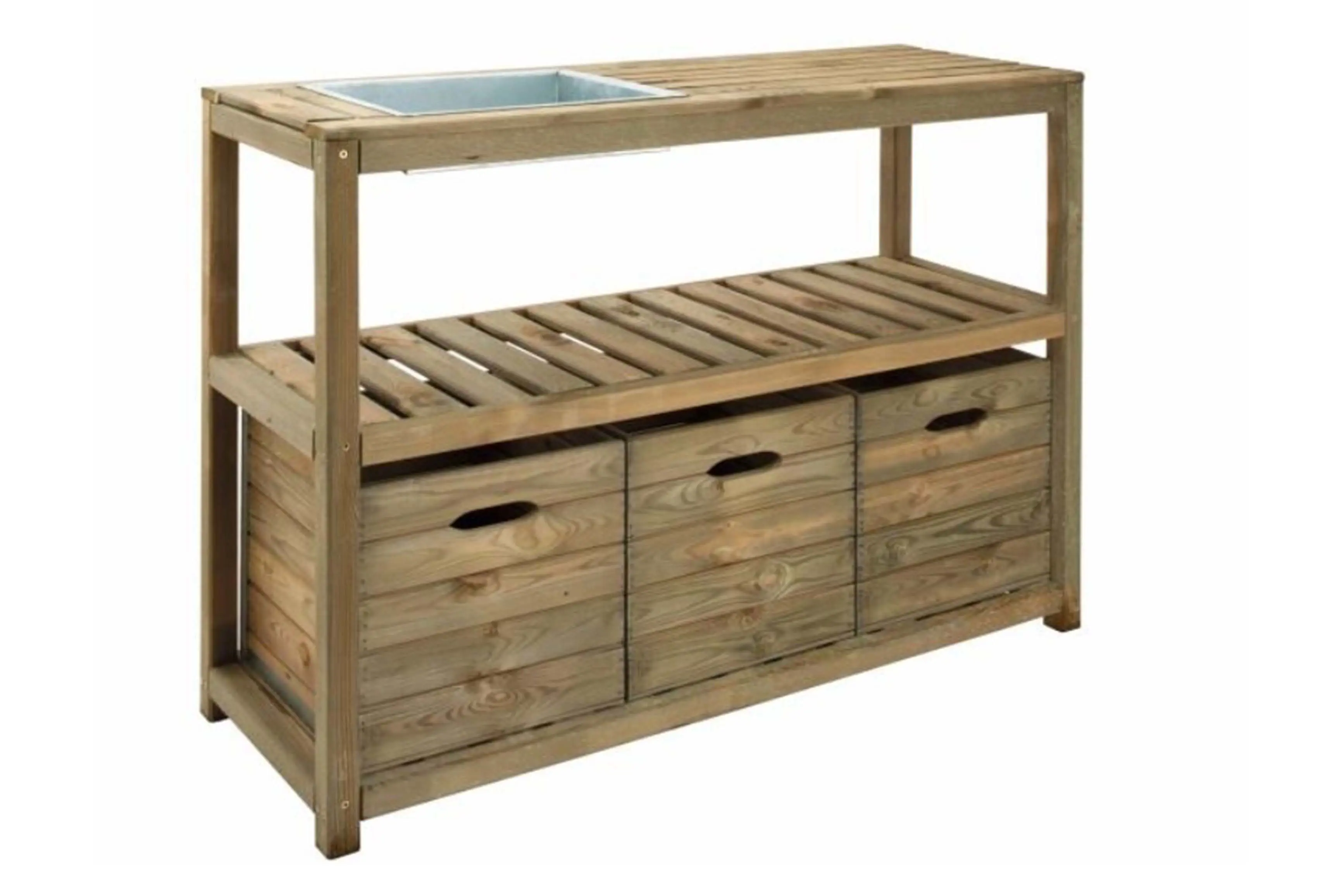 Deze tafel is werkelijk de ideale werkplaats voor elke tuinliefhebber. Deze grenenhouten werktafel in kastanjekleur heeft een verzinkte werkbak op een werkhoogte van 90 cm.