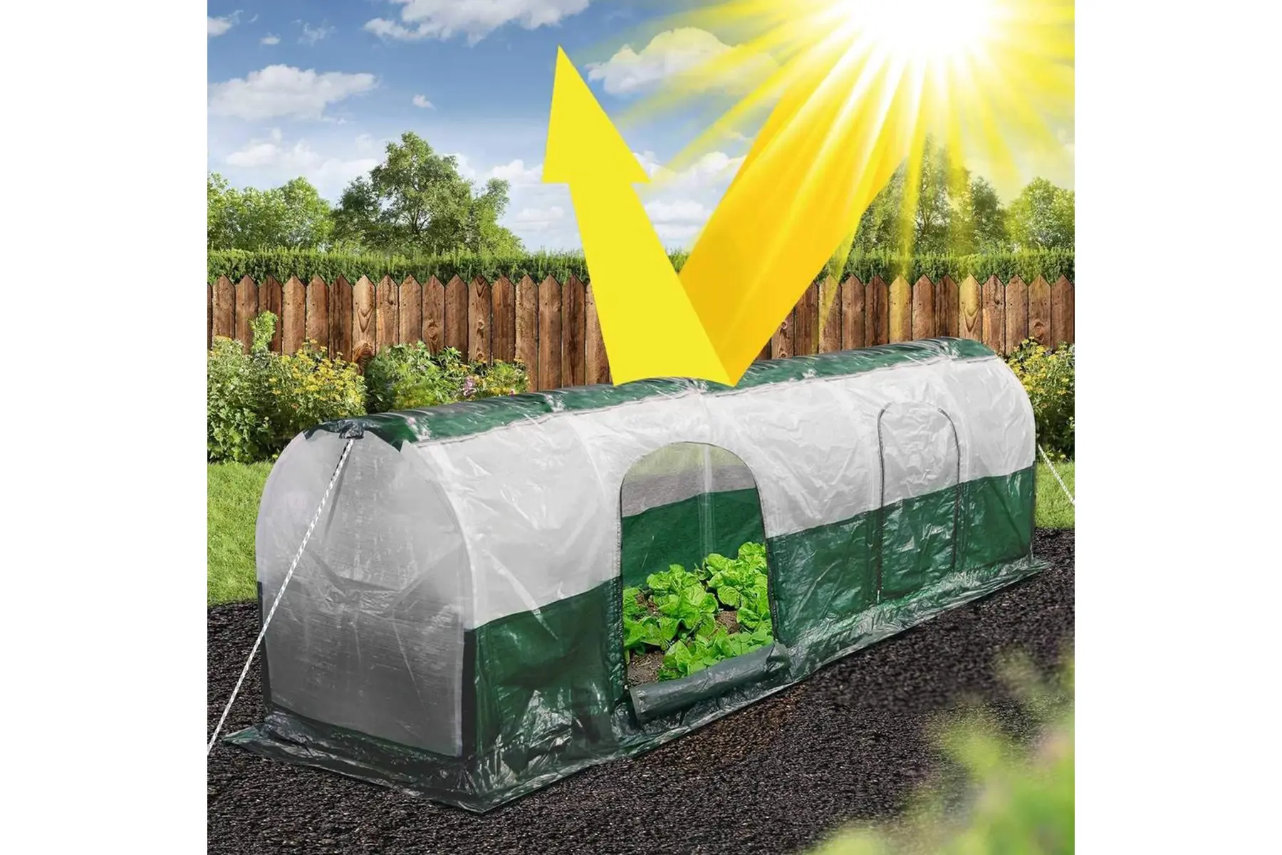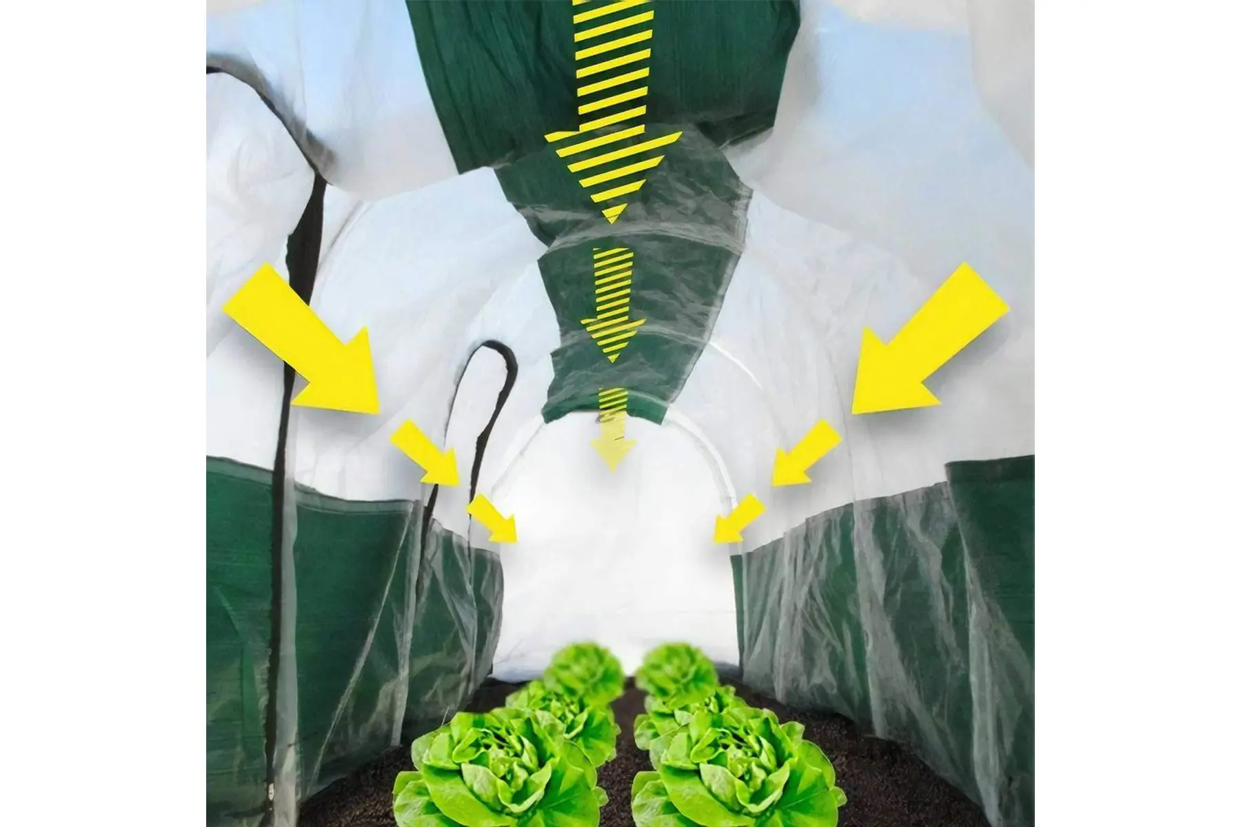 Twee openingen zorgen voor ventilatie en een makkelijke toegang tot de planten om deze te verzorgen. In het dak is er schaduwfolie genaaid tegen overmatig zonlicht. Ideale tunnel om het kweekseizoen vroeger te starten. Voor een snellere groei van de planten die eronder staan. Ideale afmetingen voor het beschermen van gewassen in verhoogde groeibedden of de moestuin.