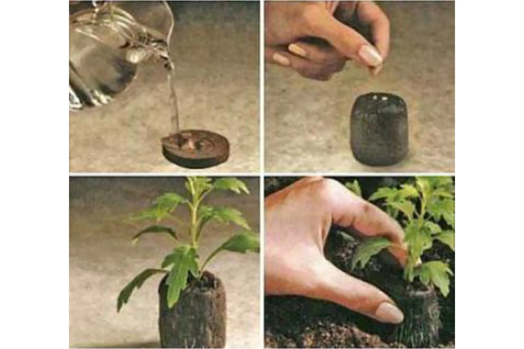 - Deze turftabletten enkele minuten in het water leggen zodat ze zich binnen enkele minuten helemaal volzuigen en er een kweekpotje ontstaat dat later rechtstreeks in de tuingrond wordt geplant.