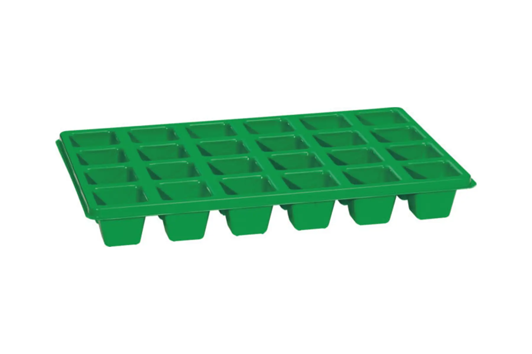 Handige kweekplaat voor het opkweken van jonge zaailingen of stekken. Deze kweektray in stevige groene kunststof heeft 24 vierkante, conische cellen van 6 x 6 x 6 cm. Elke cel is onderin voorzien van een opening voor de afwatering van hemel- of gietwater.