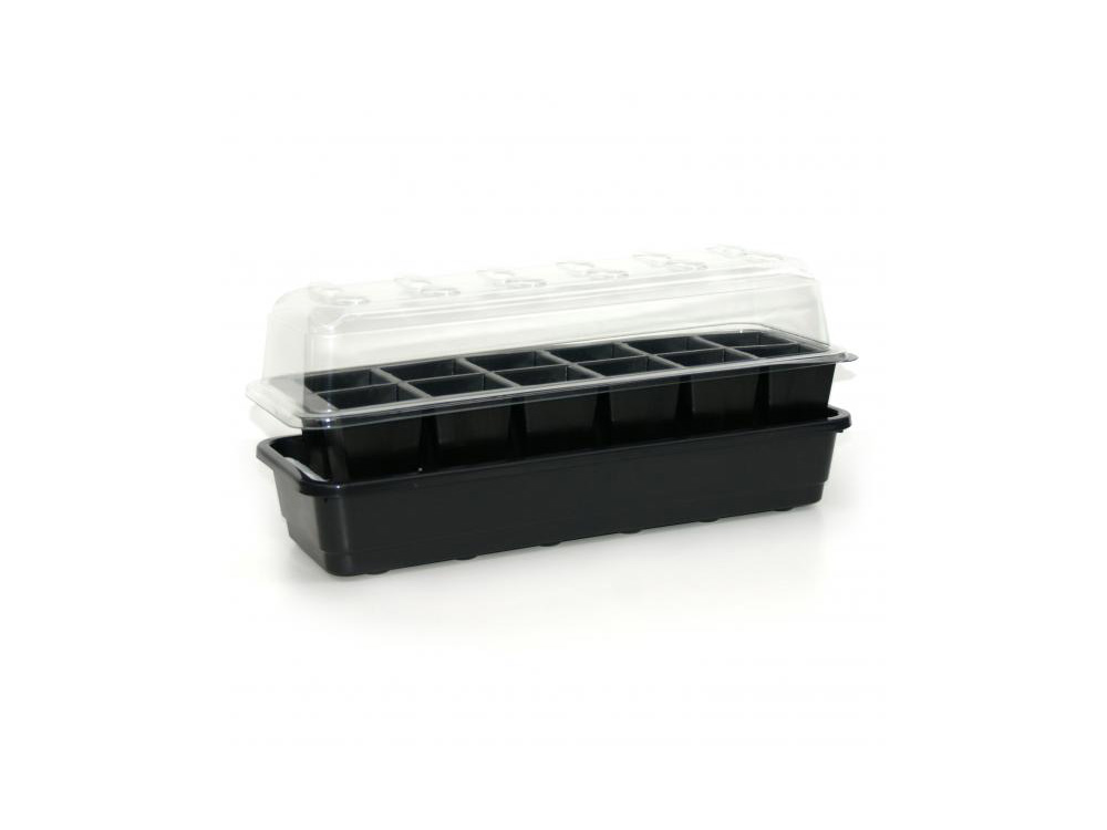 Zelf bevloeiende kweekset of zaaibak met 12 opkweekcellen. Een zeer goed functionerende kweekset geschikt voor gebruik op een vensterbank of in de serre, kas, veranda,... Ideale kweekbak voor een goede kieming van zaailingen of perfecte wortelvorming van stekken. Deze stevige zaaikas-kweekbak kan je meerdere jaren na elkaar gebruiken.