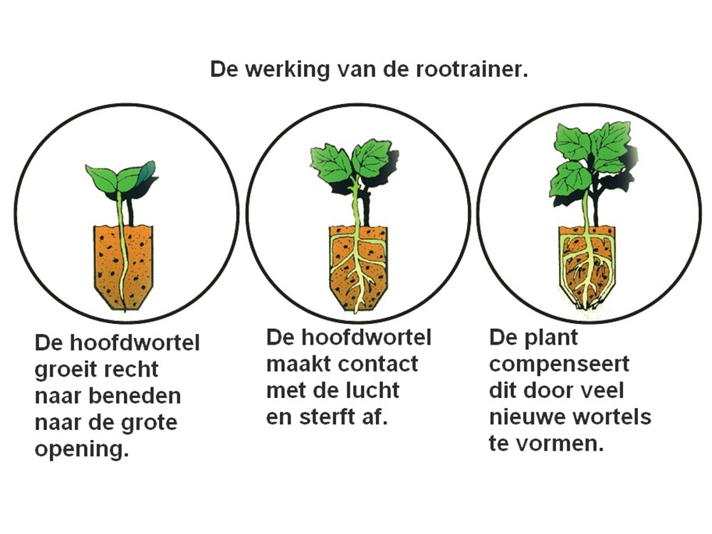 Het principe is eenvoudig. In de extra diepe cel komt de hoofdwortel snel aan het grote drainegegat op de bodem en sterft af. Hierdoor reageert de zaailing en maakt hij tal van zijwortels aan die op hun beurt mooi naar beneden worden geleid door de groeven in de celwanden. Dit kan je mooi zien wanneer je de celmodules openvouwt.