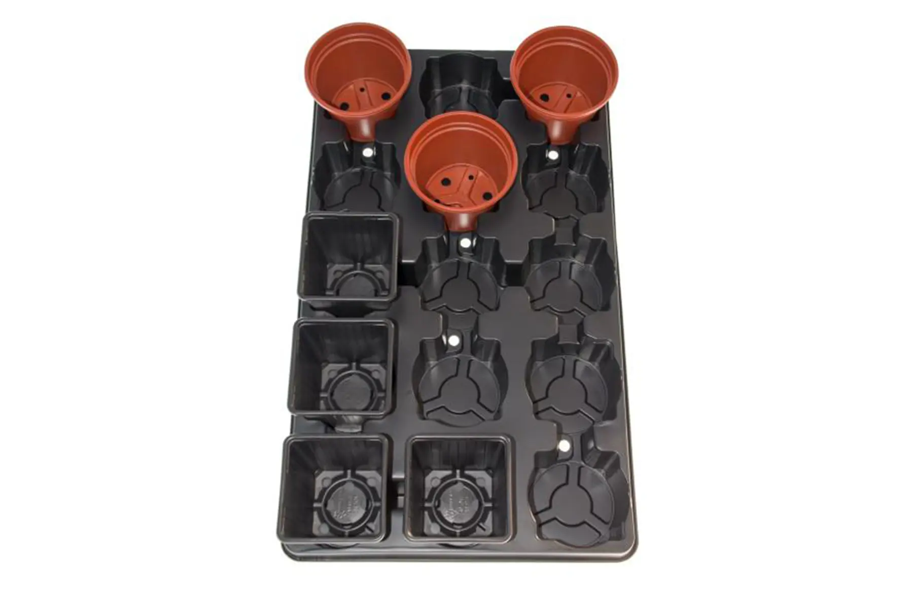 Kweektray voor ronde of voor vierkante potten. Deze herbruikbare trays bieden plaats aan 15 kweekpotjes (5 x 3). Dankzij de unieke uitsparingen passen zowel ronde als vierkante potten in de trays.